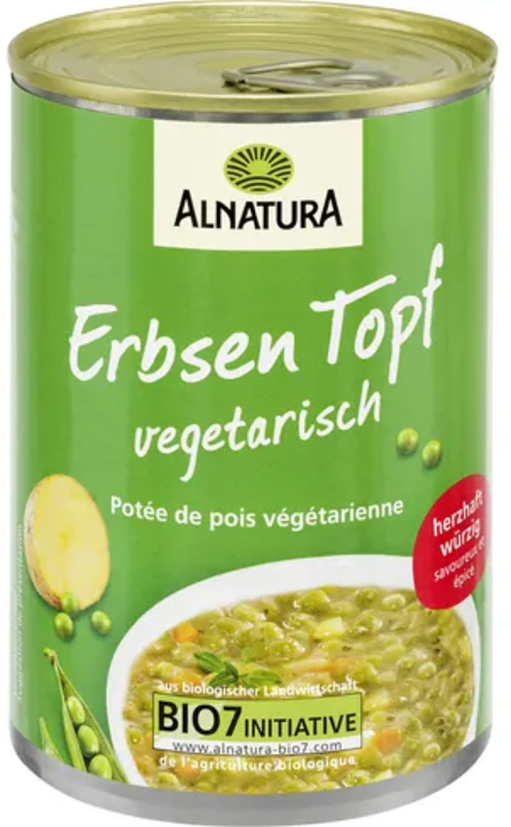Den veganska ekologiska ärtgrytan från Alnatura är färdig att ätas och behöver bara värmas kort i en kastrull. Det välkryddade receptet innehåller bland annat potatis och morötter.