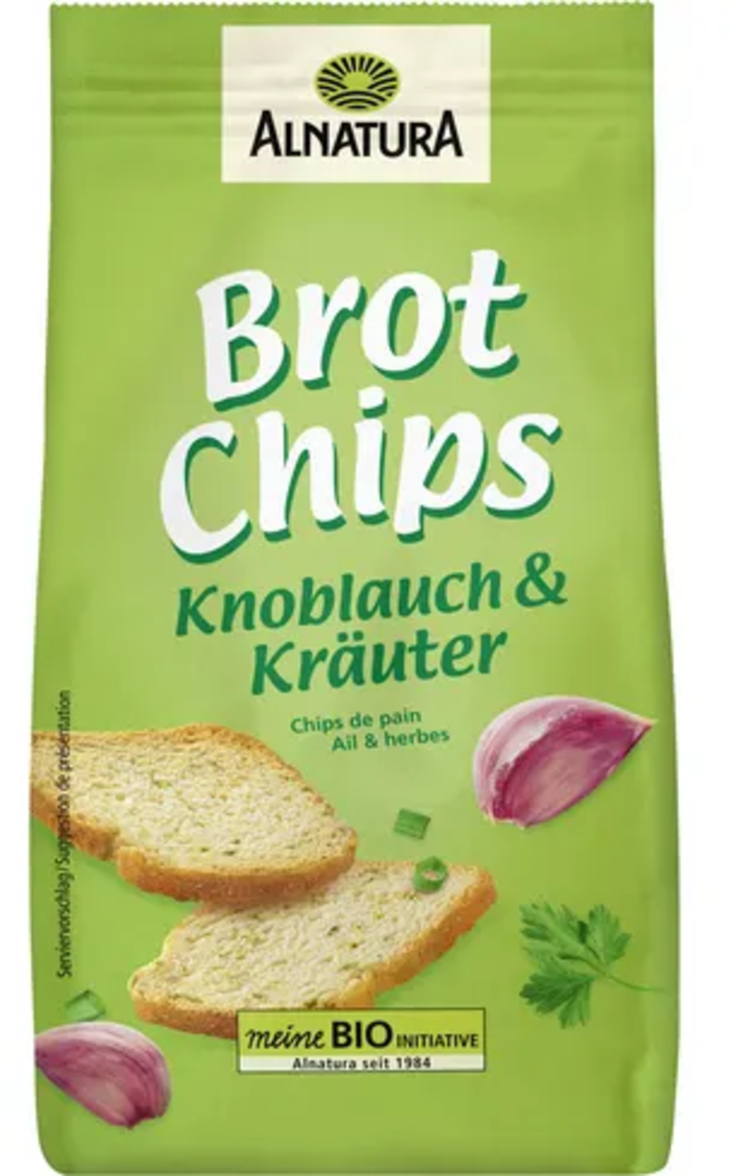 De veganska ekologiska Alnatura brödchipsen i smaken vitlök & örter är aromatiska och kryddiga och smakar särskilt krispiga. Persilja, rosmarin, chilipulver och gräslök ger brödchipsen sin unika smak.
