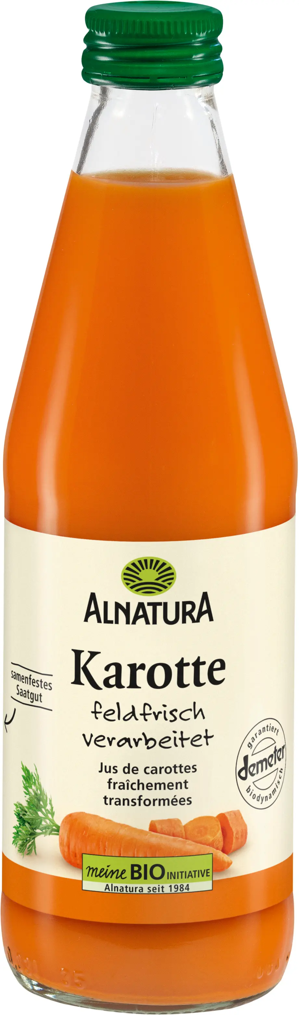 En läcker, oförfalskad ekologisk morotsjuice gjord på grönsaker från tyska Demeter-bönder. Morötterna bearbetas färska från fältet och Alnatura förädlar dem med lite citronsaft - inget annat! Smakar utmärkt ren eller blandad. Praktiskt: Den återförslutningsbara glasflaskan håller saften aromatisk i upp till 5 dagar efter öppnandet - förvara den därefter i kylskåpet.