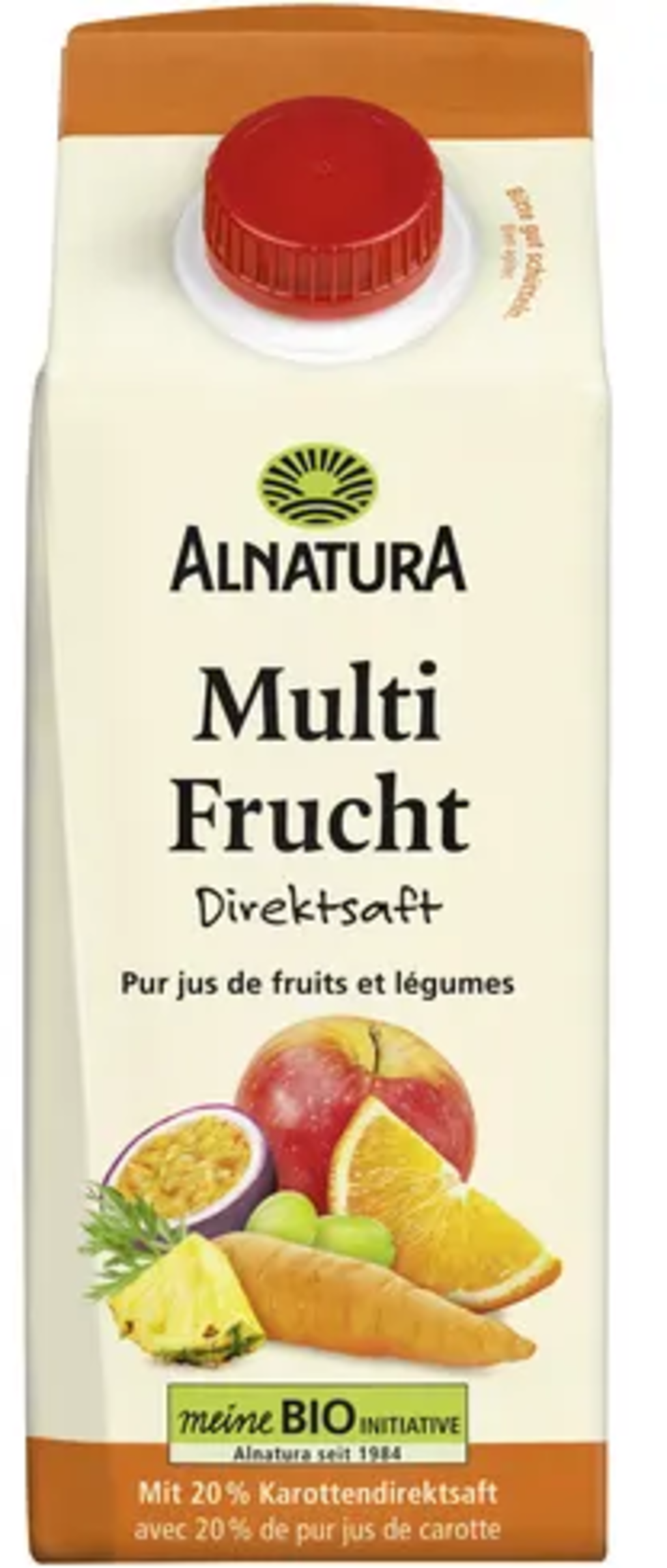 Den fruktiga multijuicen från Alnatura är försiktigt pressad, smakar utmärkt ren eller utspädd med vatten och ger också en exotisk ton till blandade drinkar eller fina sorbeter - 100 procent direkt juice från tio olika frukter och morötter.