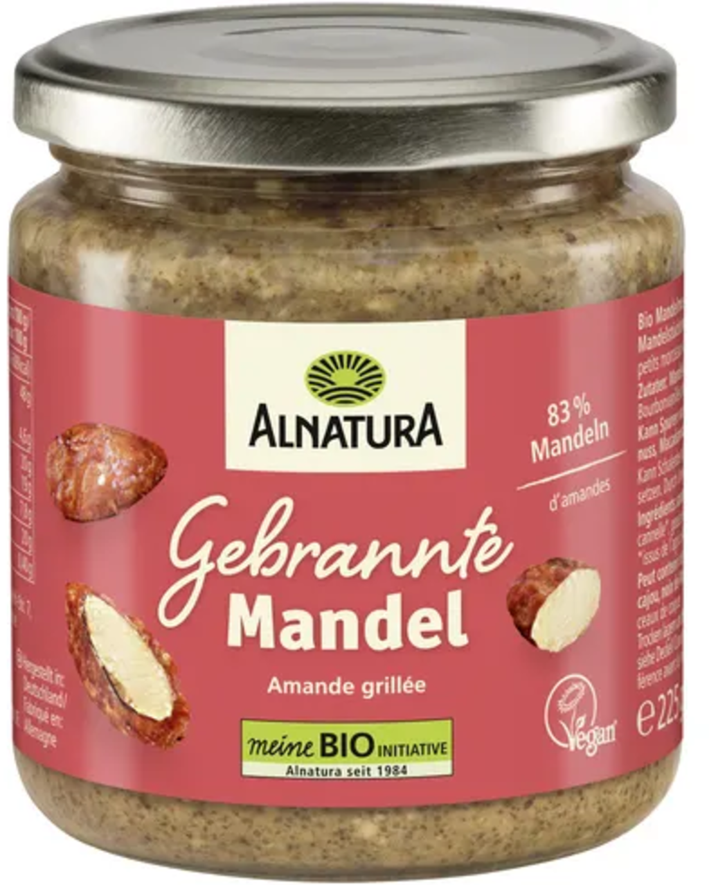 Brända mandlar, Ceylonkanel och bourbonvanilj - denna söta, krispiga puré gjord på 83 procent ekologiska mandlar kommer att skämma bort gourmeter och fans av karamell-nöttiga specialiteter! Vare sig det är som ett pålägg till ditt favoritbakverk, en fyllning till efterrätter eller helt enkelt att skeda på egen hand. Tillverkad i den bästa ekologiska Alnatura-kvaliteten, utan tillsatt socker och emulgeringsmedel.