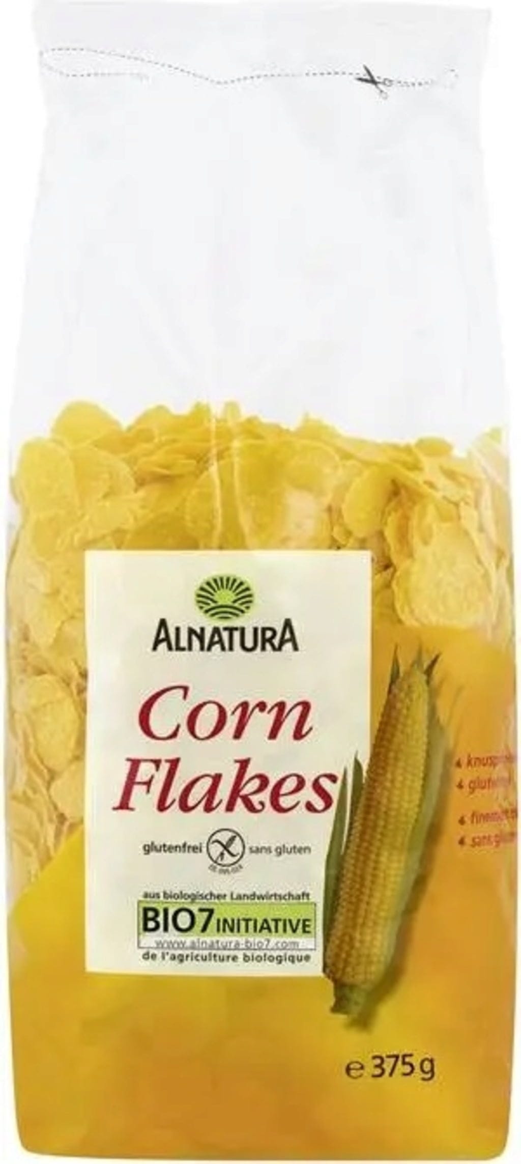 De glutenfria, krispigt fina ekologiska cornflakes från Alnatura hör helt enkelt hemma i alla frukostflingor. De raffineras med ekologiskt råsocker och lite havssalt. De smakar utmärkt i sig själva eller med mjölk och yoghurt, eller i kombination med olika sorters spannmål eller frukt.
