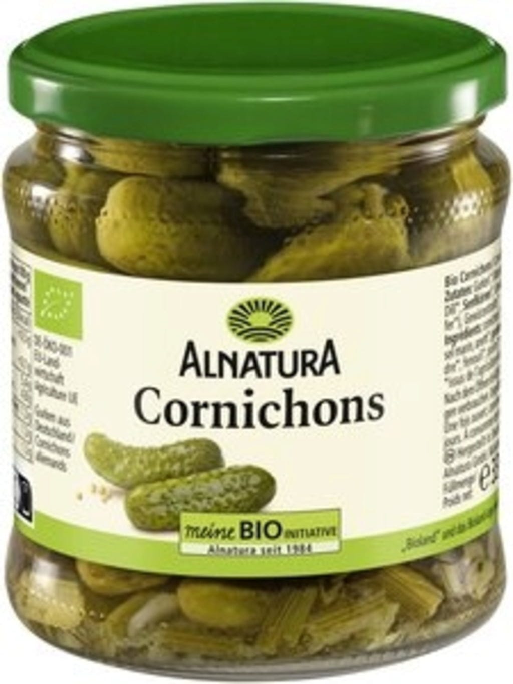 Cornichoner är krispiga gurkor som passar perfekt till snacks eller i en sallad. Dessa ekologiska cornichoner från Alnatura odlas i Tyskland, syltas sötsyrliga och förfinas med örter och kryddor.
