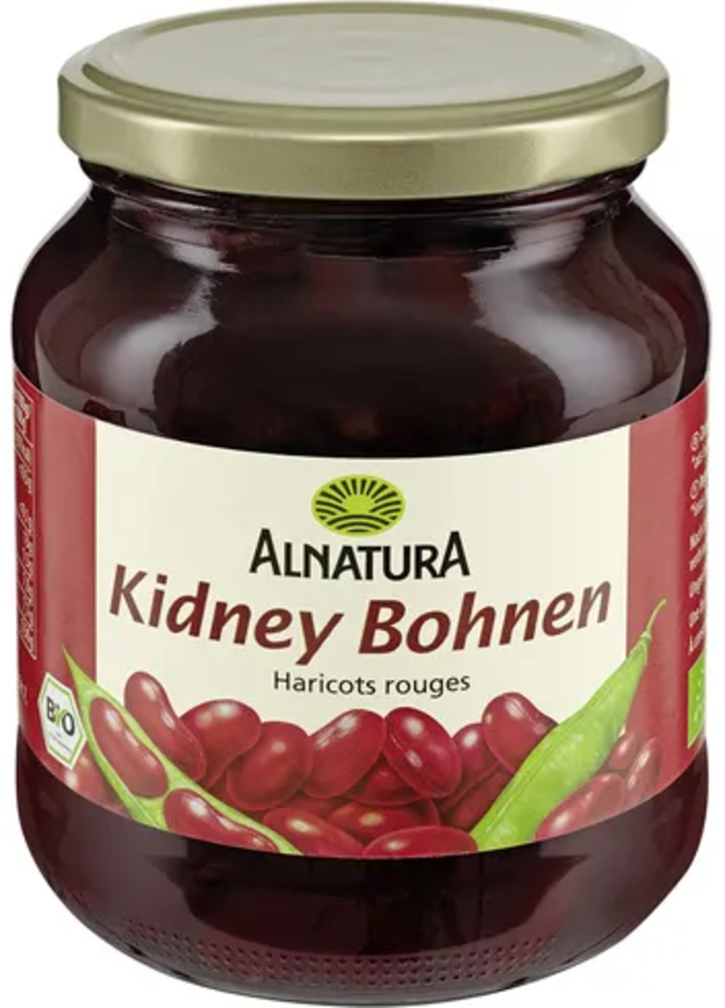 De ekologiska kidneybönorna i burk från Alnatura är förkokta och saltade. De smakar lite sött och passar perfekt i en chilirätt, sallad eller grönsaksrätt.