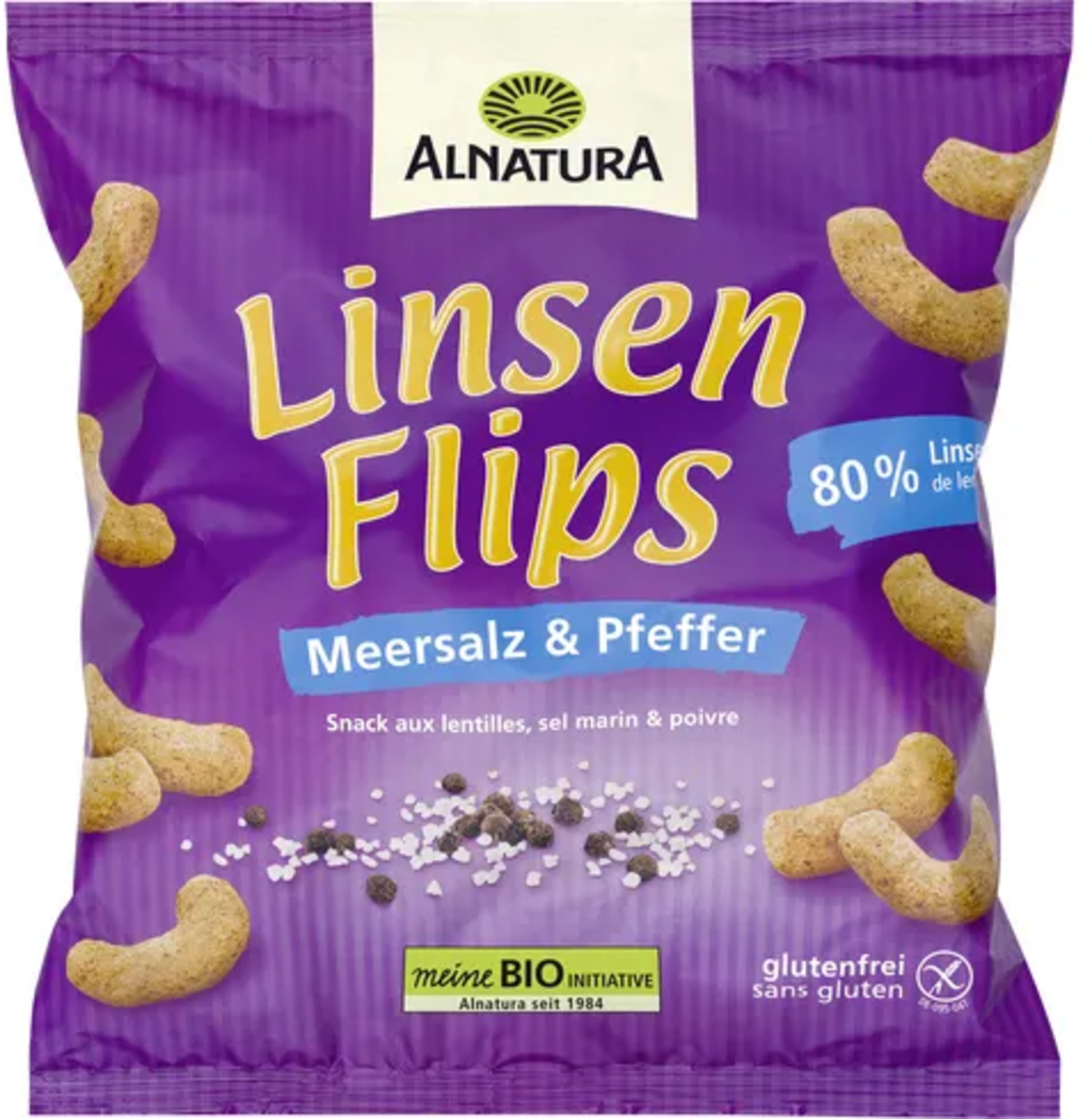 De ekologiska linsflingorna från Alnatura består av 80% linser och är smaksatta med solrosolja, lökpulver, havssalt och peppar. De innehåller varken jästextrakt eller aromämnen, är glutenfria och veganska.