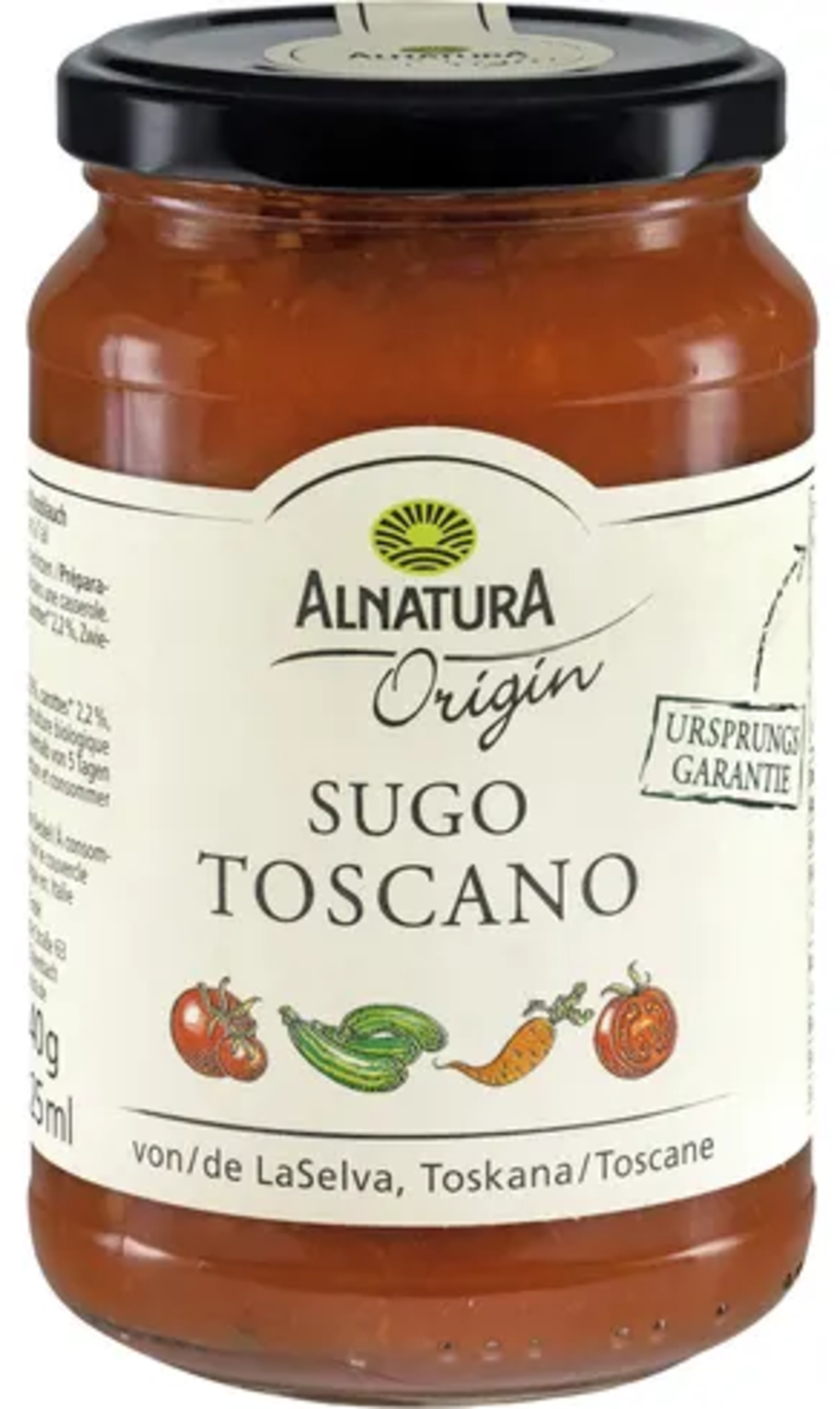 Sugo hör hemma i varje skafferi - den är praktisk att använda på pizza, i lasagne, i pastasåser etc. Alnaturas ekologiska Sugo Toscano är gjord på italienska tomater och harmoniskt avrundad med morötter, zucchini, lök och kryddor.