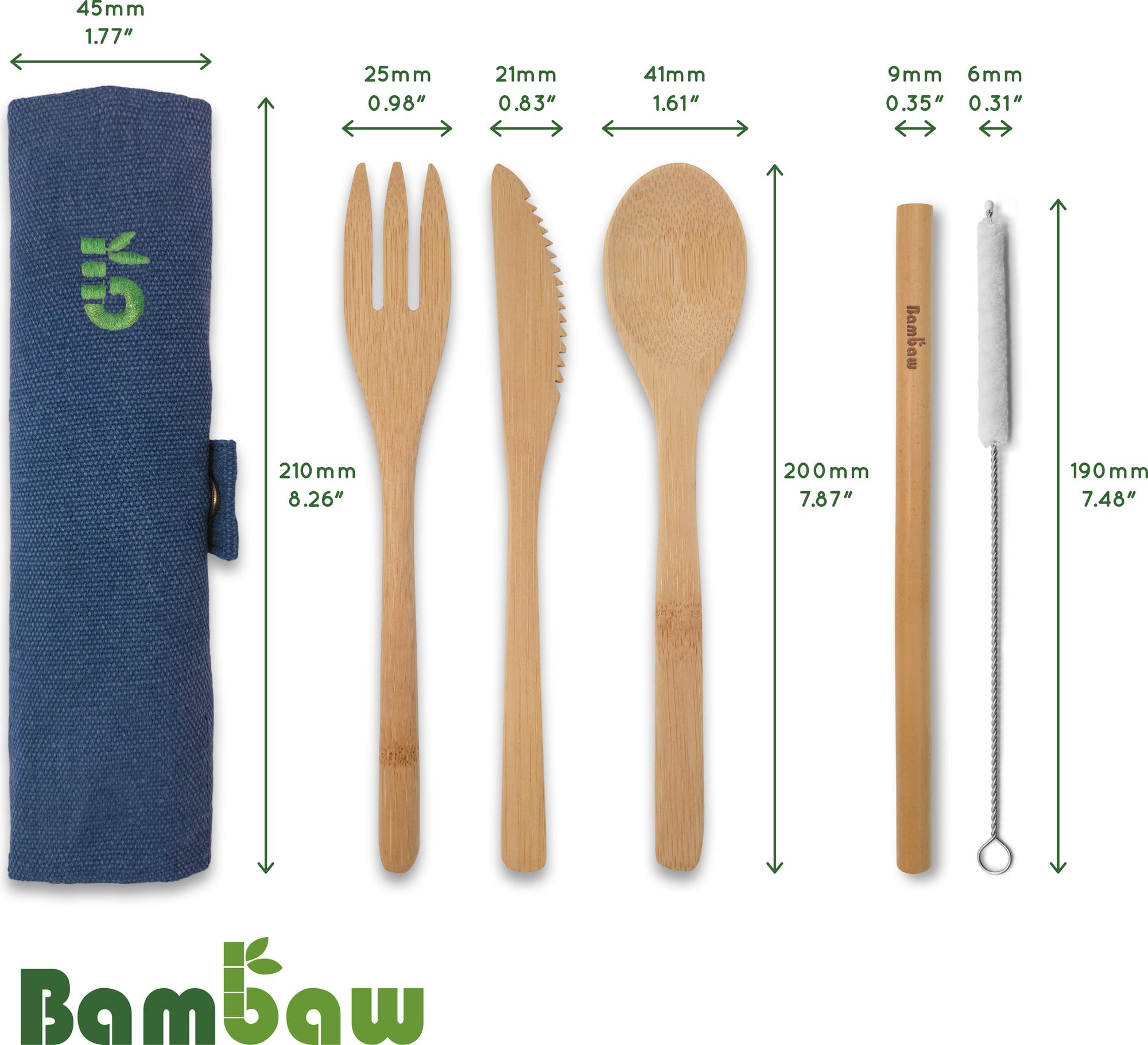 Detta set är den perfekta följeslagaren för alla som gillar att resa mycket. Oavsett om du reser, på jobbet, på en picknick i parken eller på en romantisk dejt vid sjön, med detta set är du alltid perfekt utrustad. Besticken är tillverkad av robust bambus och kan därför användas i flera år. De har behandlats med naturlig vegetabilisk olja som inte lämnar någon eftersmak. Lätta att rengöra och hålls på plats och perfekt skyddde i den praktiska bomullsväskan.