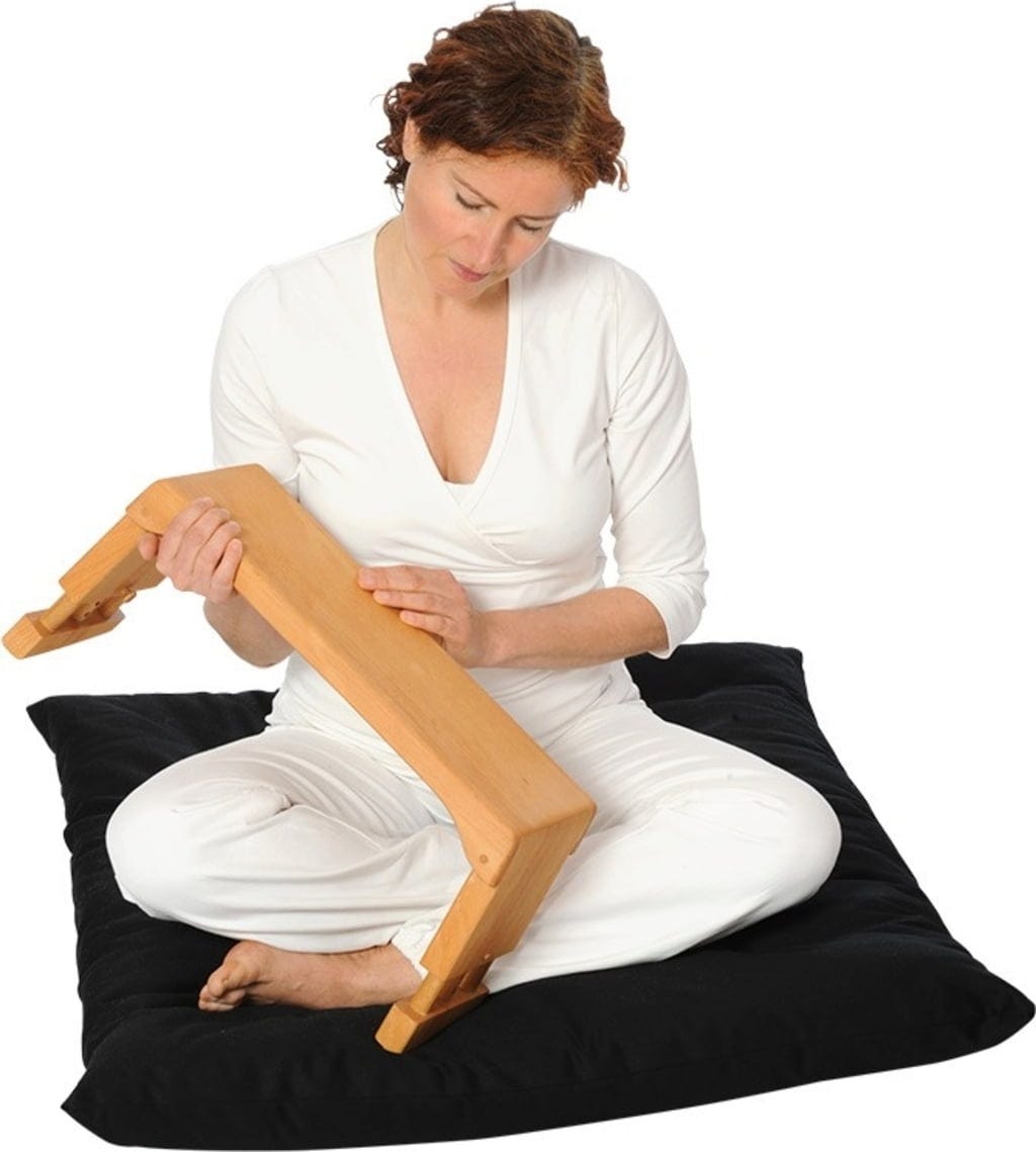 Meditationsbänken är tillverkad av massivt bokträ och klarar en vikt på upp till 125 kg. Den är perfekt för att sitta på knän/rullstolar. Sitsen har vinklats något framåt så att bäckenet vinklas något framåt och den mediterande kan sitta rakt och upprätt.