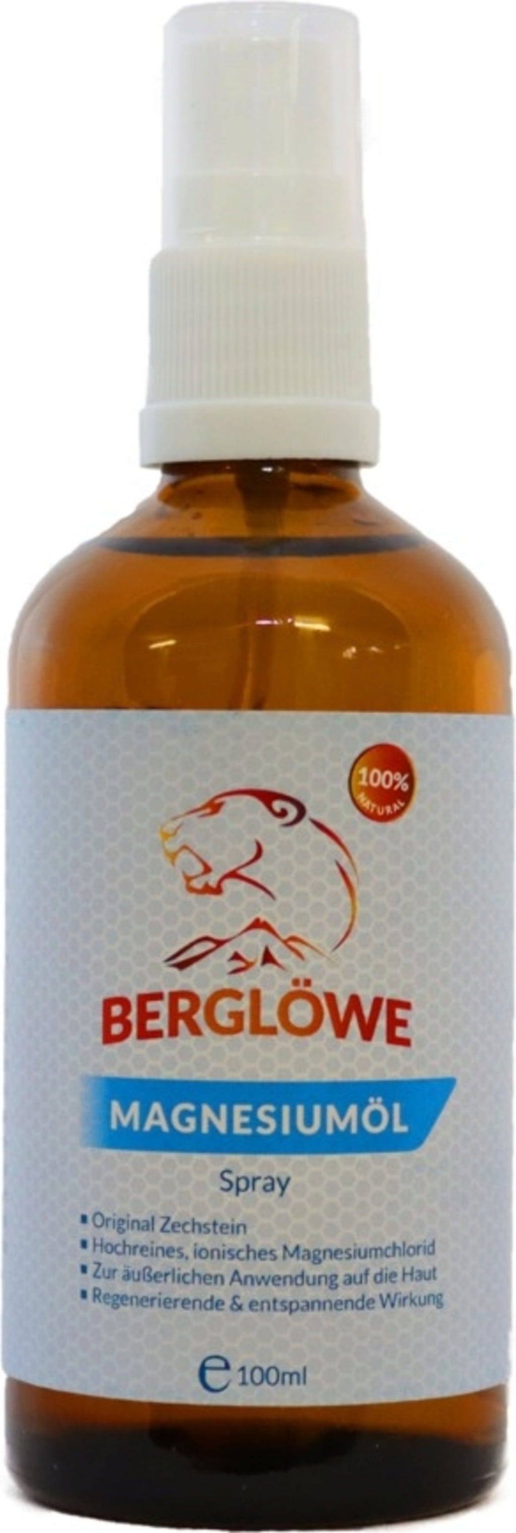 Magnesiumoljesprayen från Berglöwe innehåller 31% ren, jonisk magnesiumklorid och 69% vatten. Den passar perfekt för extern användning på huden efter fysisk ansträngning.