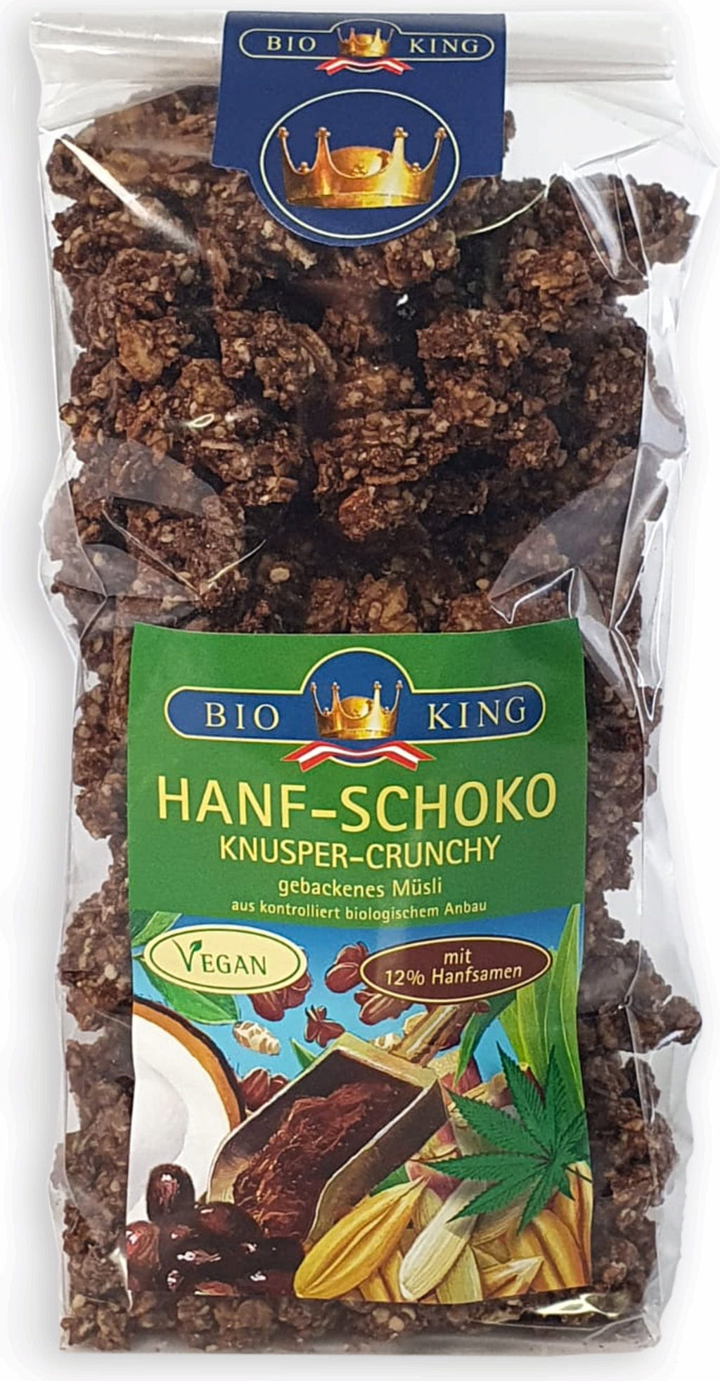 Det krispigt bakade Crunchy Hemp-Choco ekologiska müsliet från Bio King har tillverkats under skonsamma förhållanden och innehåller en 12 % andel av ekologiskt kontrollerade hampfrön. Havregryn, osötade dinkel puffar, kokosflingor och naturligtvis smältande choklad tillsammans med de skalade hampfröna ger en produkt av högsta klass. Oavsett om det är till frukost eller bara som ett mellanmål, är müsliet en riktig hit vid alla tider på dygnet.