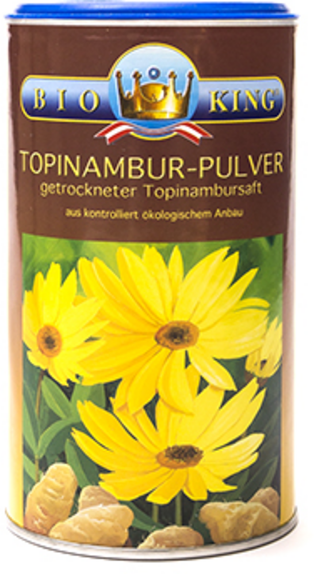 Topinambur, en korgblomma, är nära släkt med solrosen och räknas till nyttoväxterna. Pulvret tillverkas från den torkade saften från rotknölen.