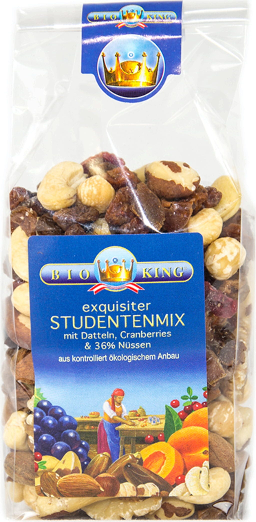 BioKing använder endast noggrant utvalda råvaror, vilka även återfinns i Studentmixen. Mixen av nötter, dadlar, sultanrussin och tranbär är perfekt som ett litet mellanmål när du är på språng.