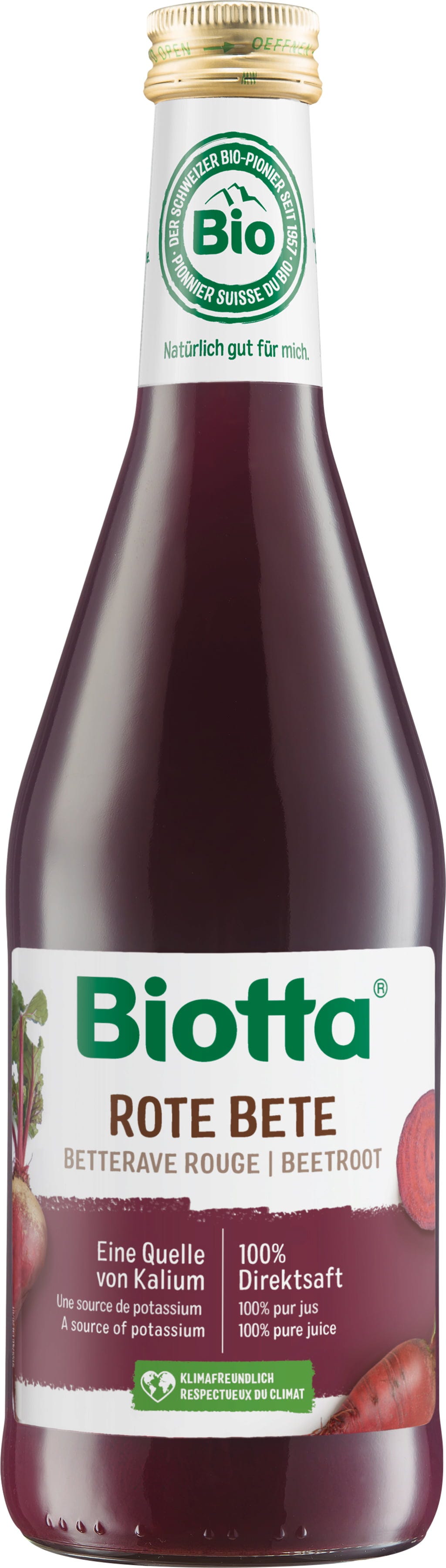 Biotta rödbetasaft är 100% färskpressad ekologisk juice, direkt från fältet i flaskan. Många organiska rödbetor växer och trivs i de bördiga jordarna i Bodensjöregionen. Ekologiska jordbrukare från regionen levererar knölarna nyskördade till Biotta Manufaktur i Tägerwilen. Där bearbetas de färgglada grönsakerna till naturlig Biotta-rödbetasaft. Den är populär bland både vuxna och barn.