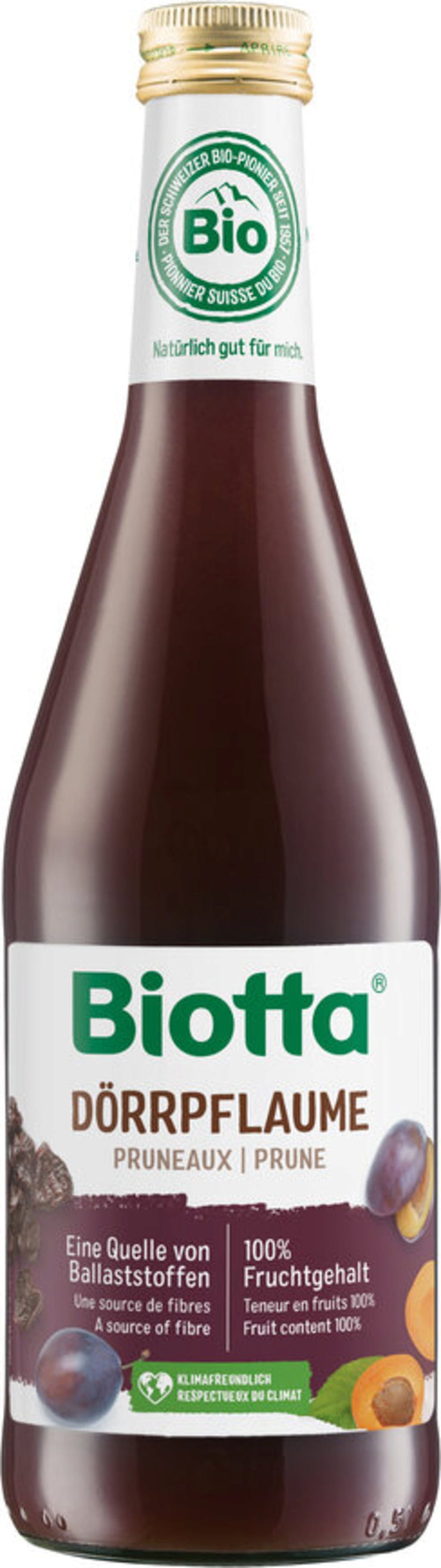 Biotta torkade plommon är en 100% direktjuice gjord av solmogna ekologiska frukter. Den kombinerar saftiga ekologiska plommon och handplockade ekologiska katrinplommon med ekologiska aprikoser, ekologiska druvor och ekologiska aroniabär. Den här utvalda sammansättningen ger en syrlig, fruktig smak och är samtidigt en naturlig källa till fibrer och kalium.