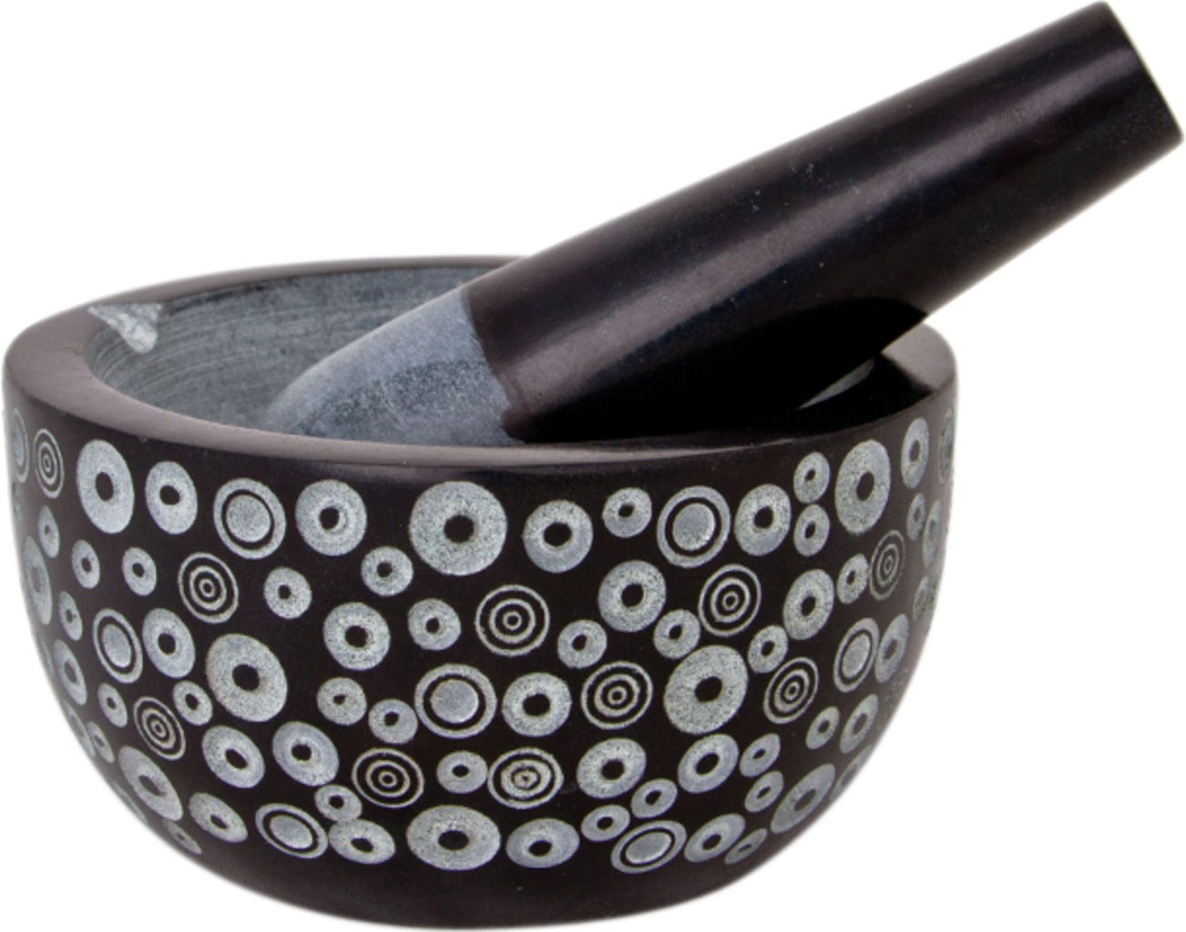 Morteln SATURN i softstone är dekorerad med ett iögonfallande cirkelmönster och är tillverkad enligt FAIR TRADE-principer.