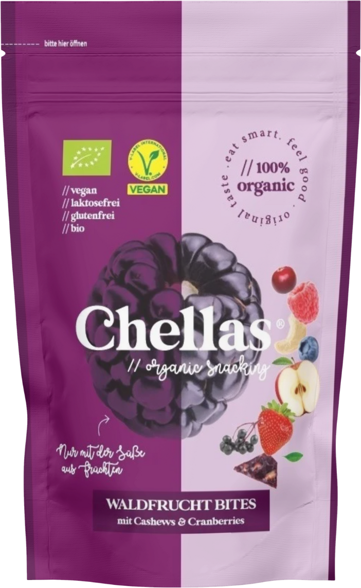 Chellas ekologiska vilda bärbitar ger bärens fulla kraft till en praktisk storlek: jordgubbar, björnbär, blåbär, hallon och fläderbär blandas med krispiga cashewnötter och fruktiga tranbär för en intensiv smakupplevelse. Sötman kommer uteslutande från själva frukten – utan några artificiella tillsatser, palmolja eller socker. De är kärleksfullt handgjorda i Österrike och imponerar med sin kvalitet och naturlighet. Oavsett om de är på kontoret, på språng eller på resande fot – den praktiska färskhetspåsen gör Chellas till den perfekta vardagsföljeslagaren.
