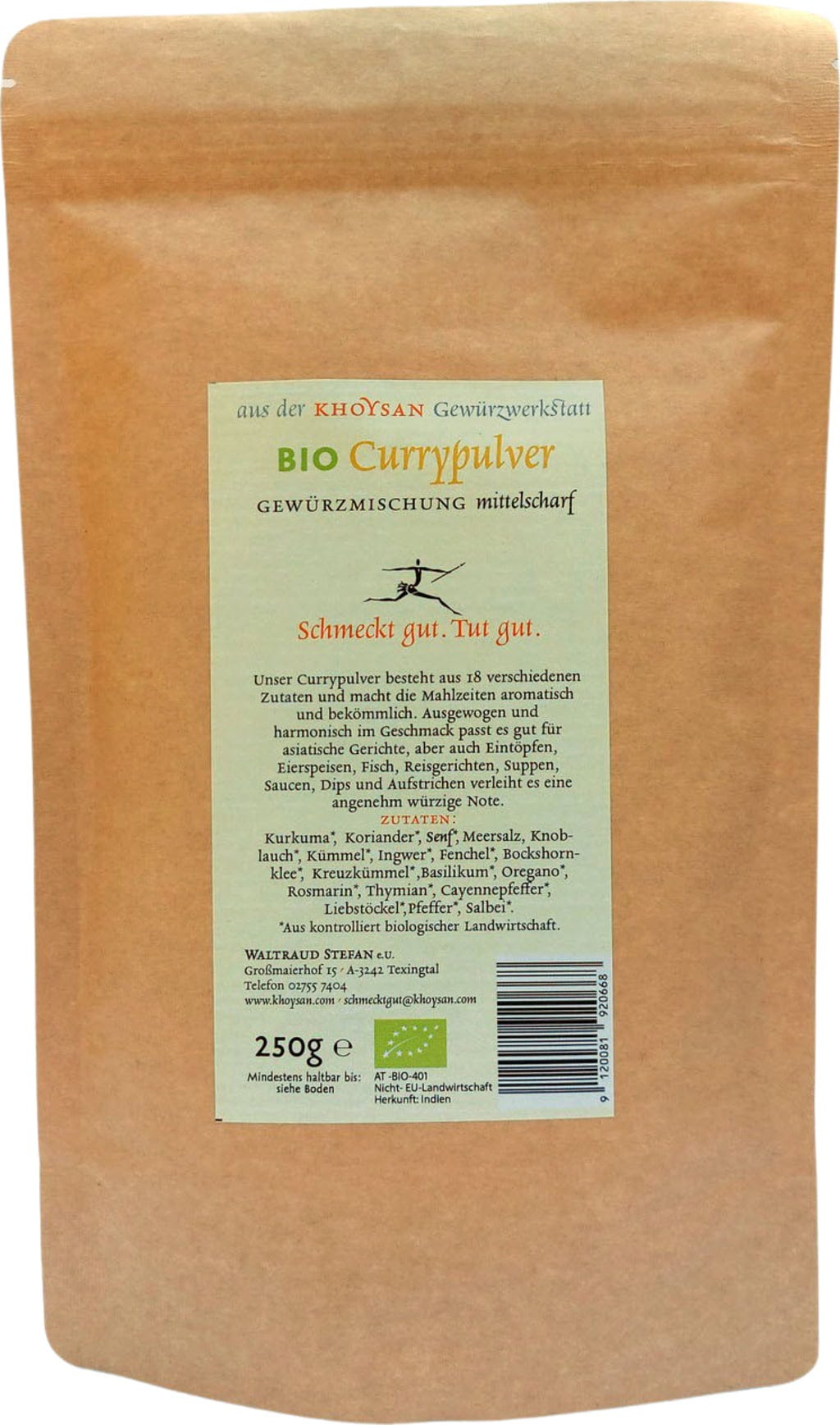 Med sin medelhöga kryddighet ger Khoysans ekologiska currypulver dina rätter en tilltalande och utsökt smak. 18 utvalda ingredienser skapar en kryddig smak med perfekt arom. Du kan använda den för att förfina asiatiska rätter, fisk, ris, soppor, såser eller pålägg särskilt bra.