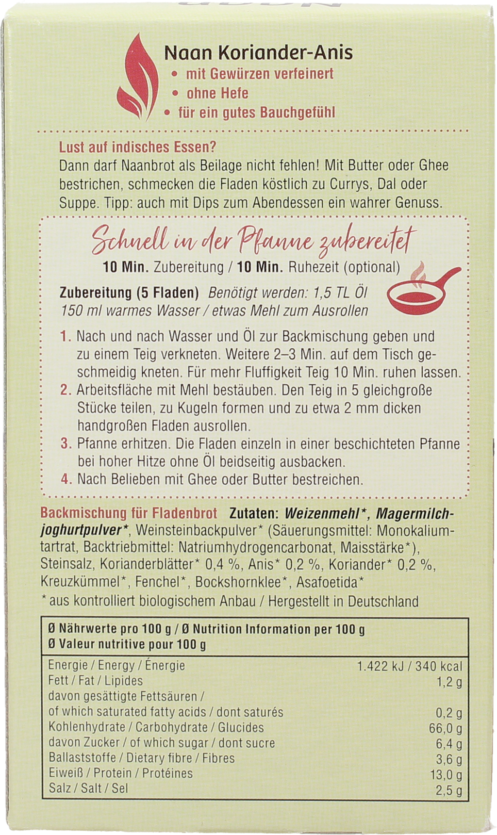 Vetemjöl[1], Magermilchjoghurtpulver[1], Bakpulver med vinsyra[1] (Monokaliumtartrat (E336)[2], Natriumhydrogencarbonat[3], Majsstärkelse[1]), Bergsalt, 0,4 % Korianderblätter[1], 0,2 % anis[1], 0,2 % Koriander[1], kummin[1], Fänkål[1], Bockhornsklöver[1], Asant (Asafoetida)[1]