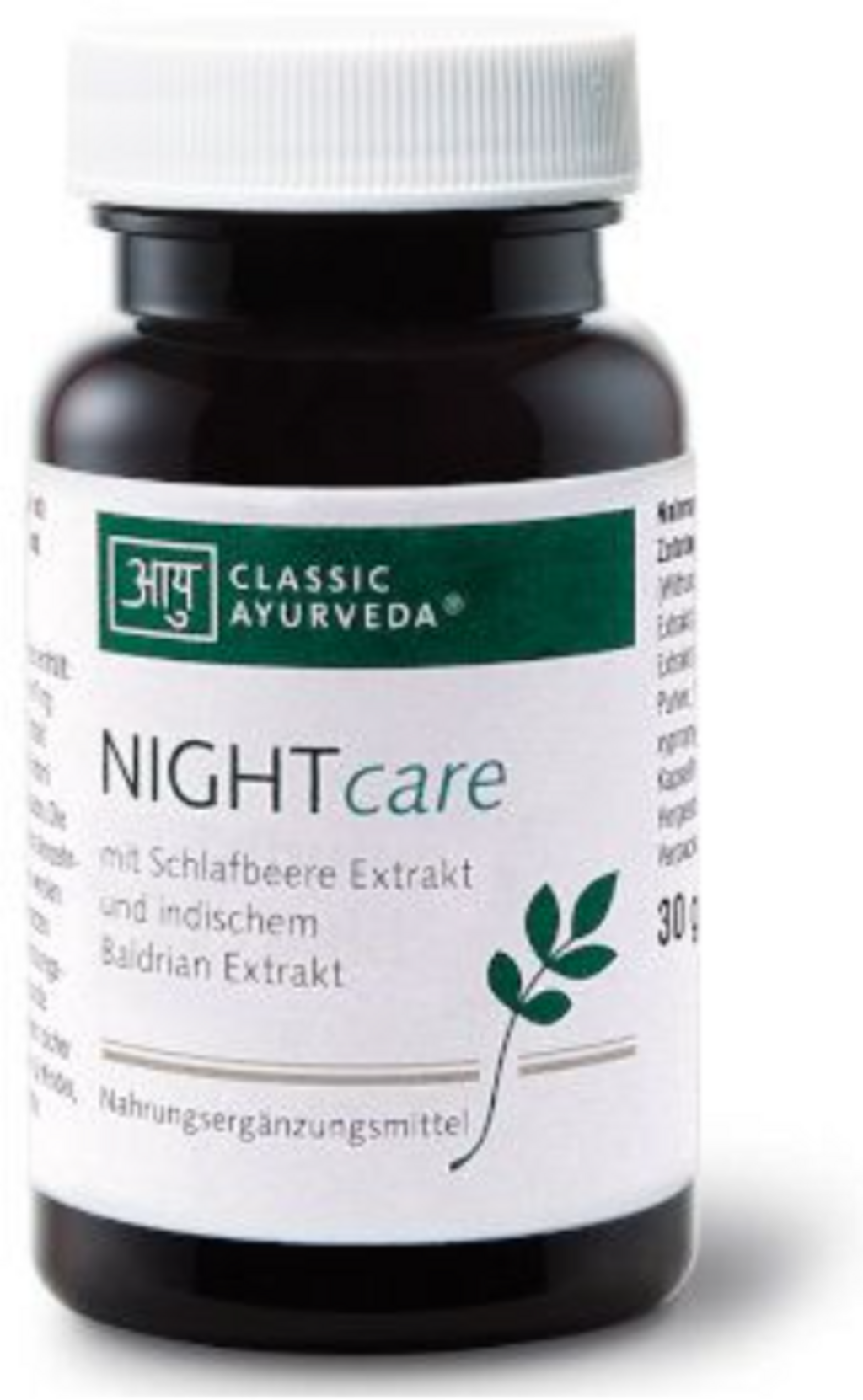 NIGHTcare-kapslarna från Classic Ayurveda innehåller en noggrant sammansatt blandning av traditionella växtextrakt. Recepturen består av ashwagandha (sömnbär), indisk valeriana (tagara), brahmi och mandukaparni. Alla ingredienser kommer från rena, växtbaserade råvaror från Indien.