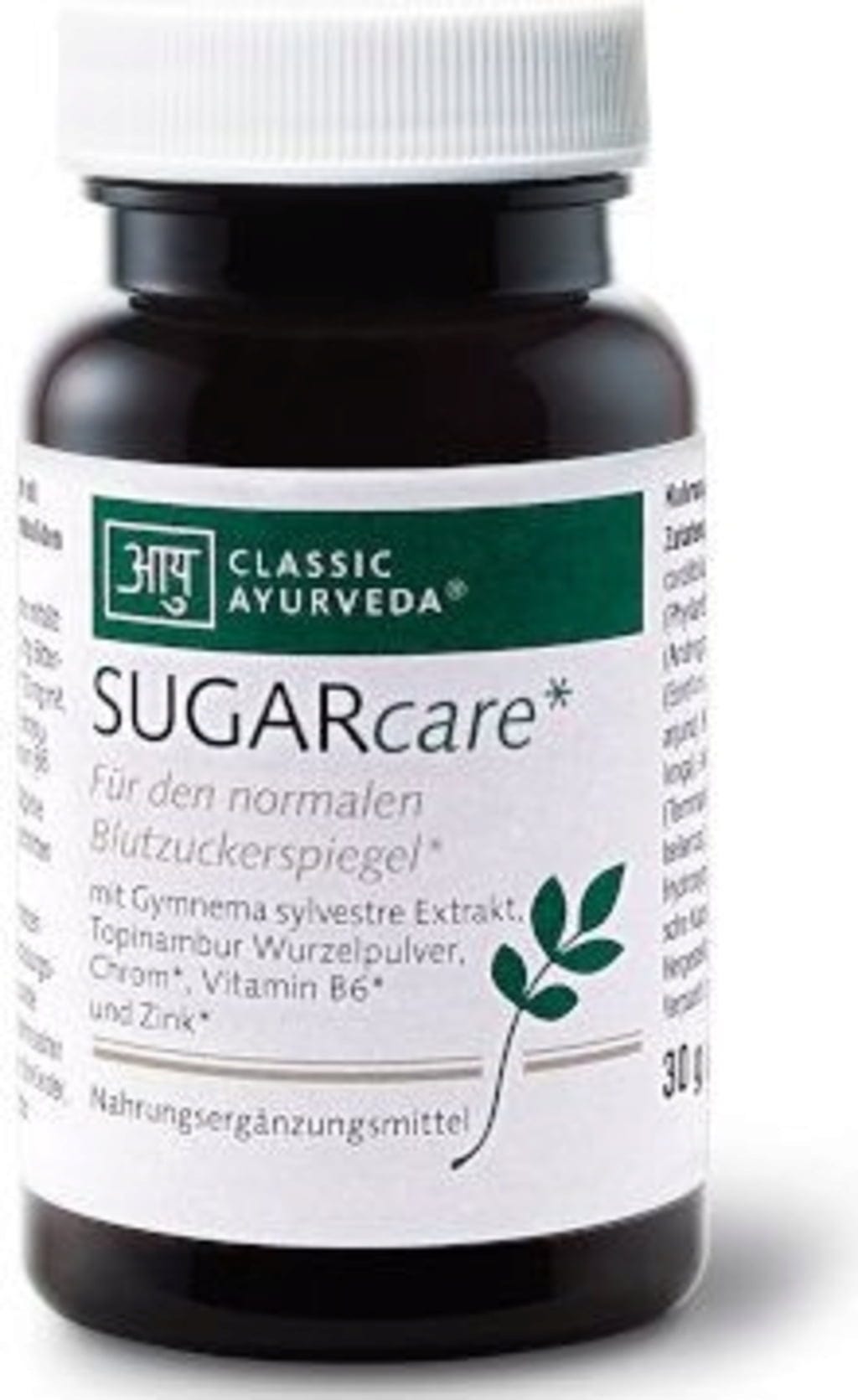 SUGARcare-kapslarna från Classic Ayurveda kombinerar viktiga mikronäringsämnen med ett urval traditionella växtextrakt. Recepturen baseras på gymnema sylvestre och jordärtskockspulver, kompletterat med extrakt av amla, guduchi och gurkmeja samt triphalapulver. Sammansättningen är särskilt framtagen för att komplettera den dagliga kosten.