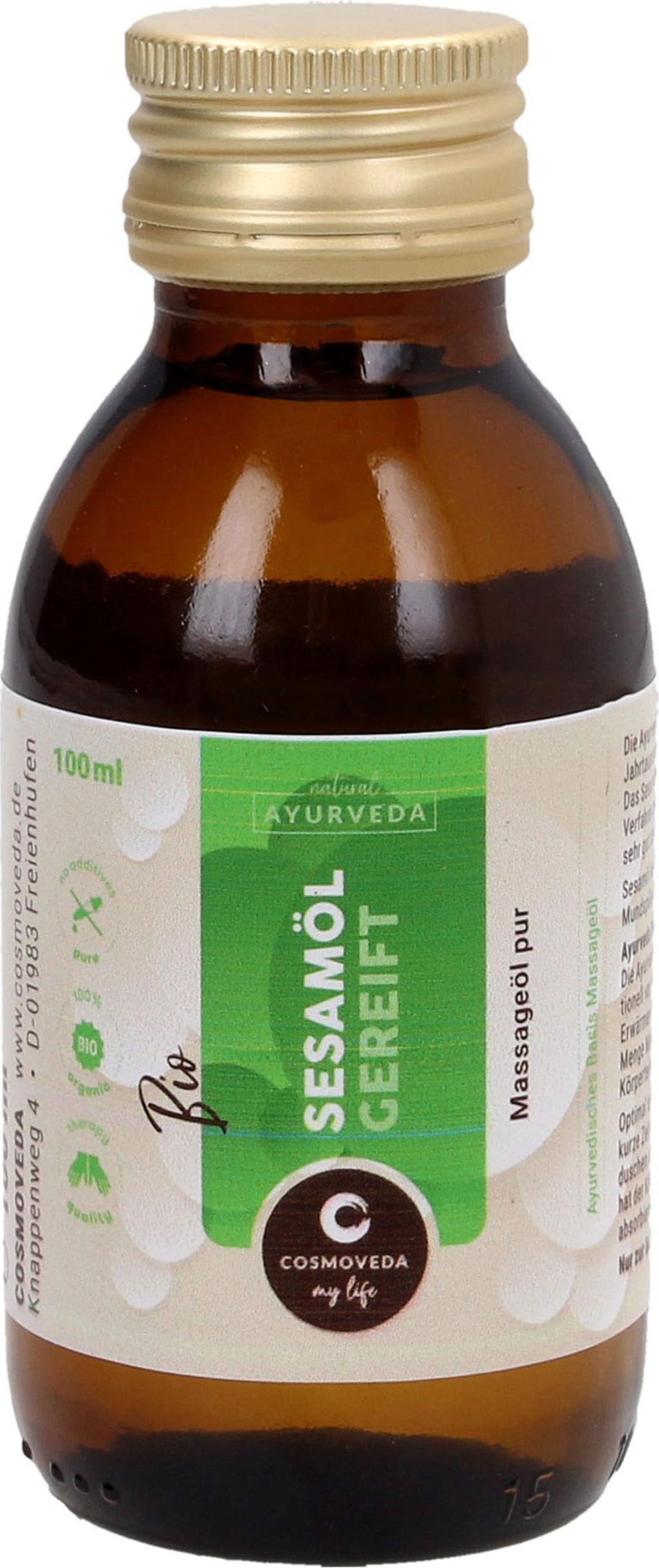 Sesamolja - känd och använd som massageolja i Ayurveda i tusentals år. Cosmovedas sesamolja mognas med traditionella metoder och är därför en förstklassig ekologisk massageolja som lämpar sig för att massera alla delar av kroppen.