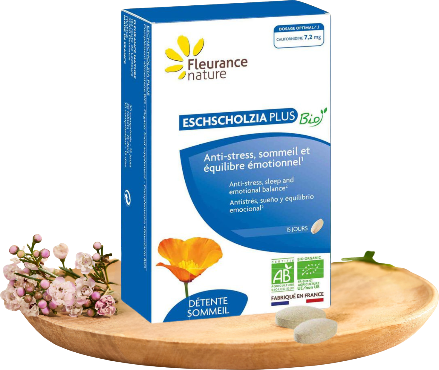 Eschscholzia är även känd som kalifornisk vallmo eller guldvallmo. För denna produkt används en växt som odlas ekologiskt i det franska departementet Loir-et-Cher.