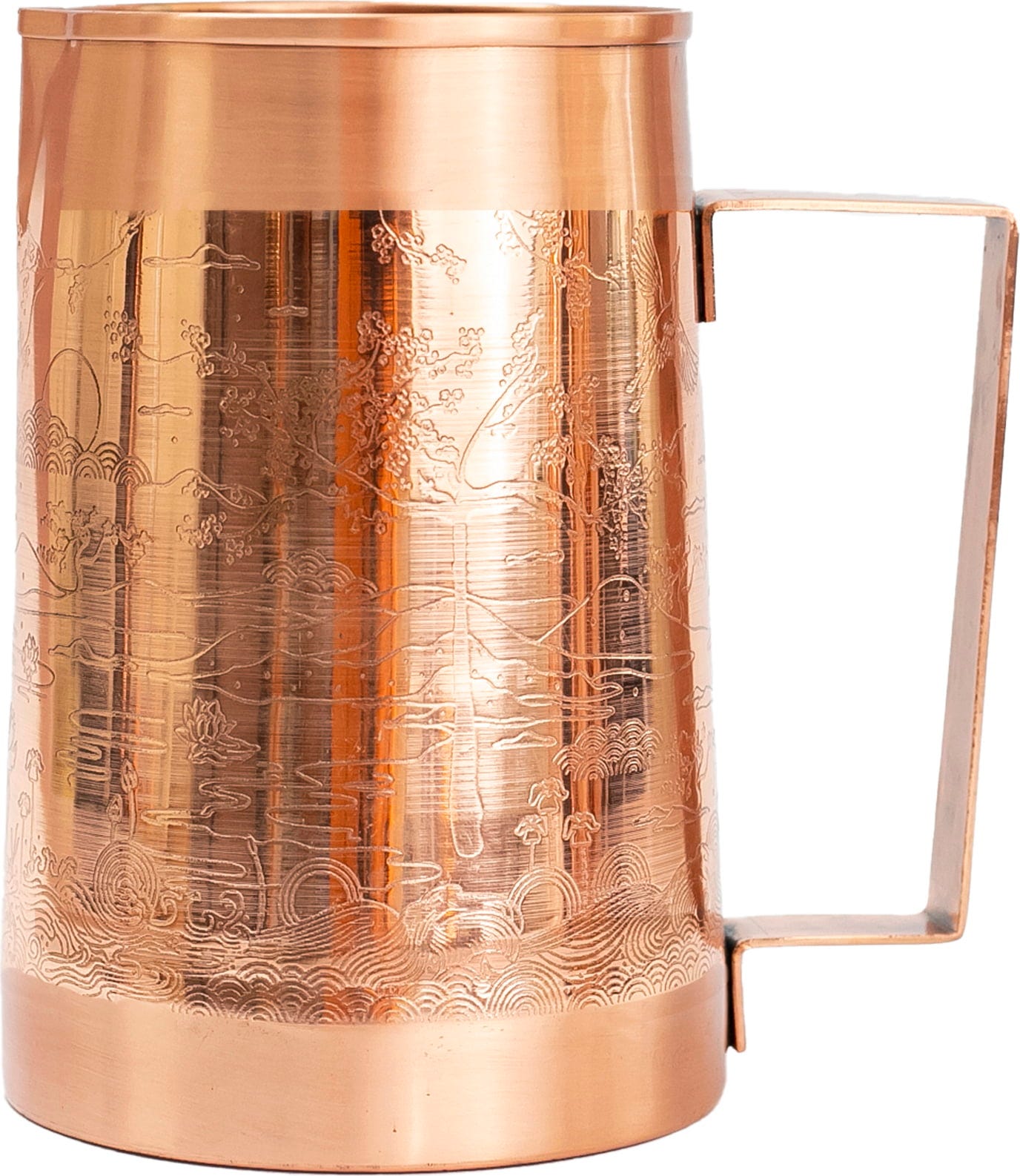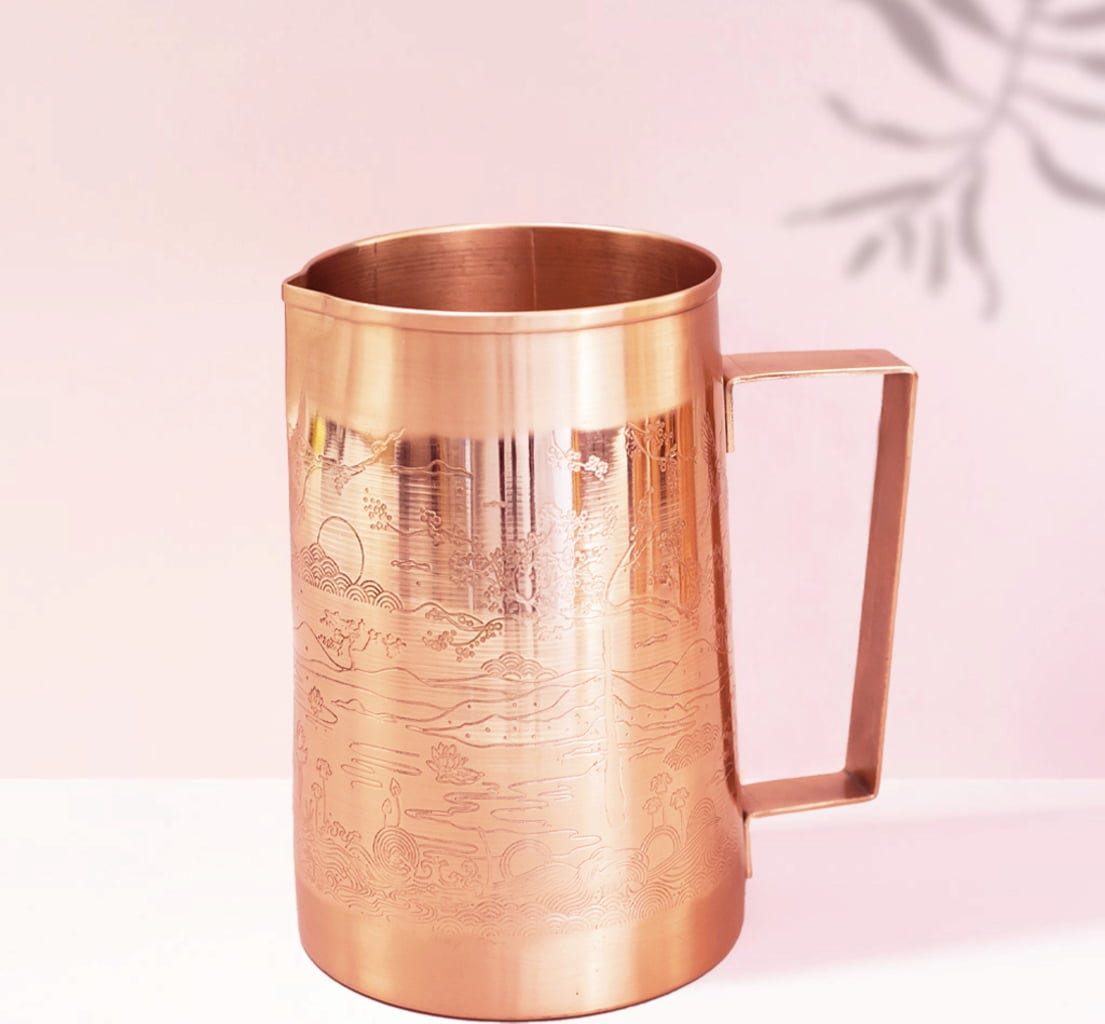 Denna kopparkanna är perfekt för att stilrent servera vatten utan kolsyra. Eller varför inte använda den som en vacker blomvas? Kannan är gjord av livsmedelssäkert koppar och är kärleksfullt handgjord i Indien. Den kombinerar modern design med traditionellt hantverk. Utsidan är förseglad med ett livsmedelssäkert lack och insidan är naturlig för att ge alkaliskt vatten.