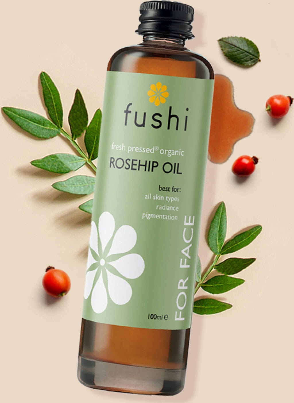 Återfuktande och snabbt absorberande olja erhållen från nyponfrön. Ekologisk nyponolja innehåller essentiella fettsyror, antioxidanter, vitamin A, C & E och bioflavonoider. Denna kombination stimulerar regenereringen av hudceller, reparerar skadade och torra hudområden och motverkar för tidigt åldrande av huden. Den återfuktande nyponoljan från Fushi lämpar sig bland annat för vård av flagnande hud, ärr och bristningar.