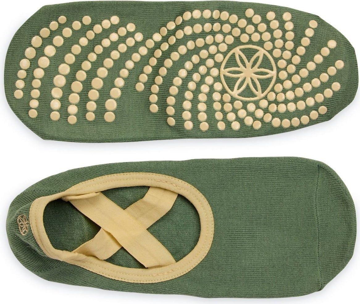 GAIAM Barre-strumpor i Olive Haze är utformade för övningar både på och utanför mattan. Den balettinspirerade designen med korsade remmar gör att strumporna sitter säkert på plats under rörelser i pilates eller dans.