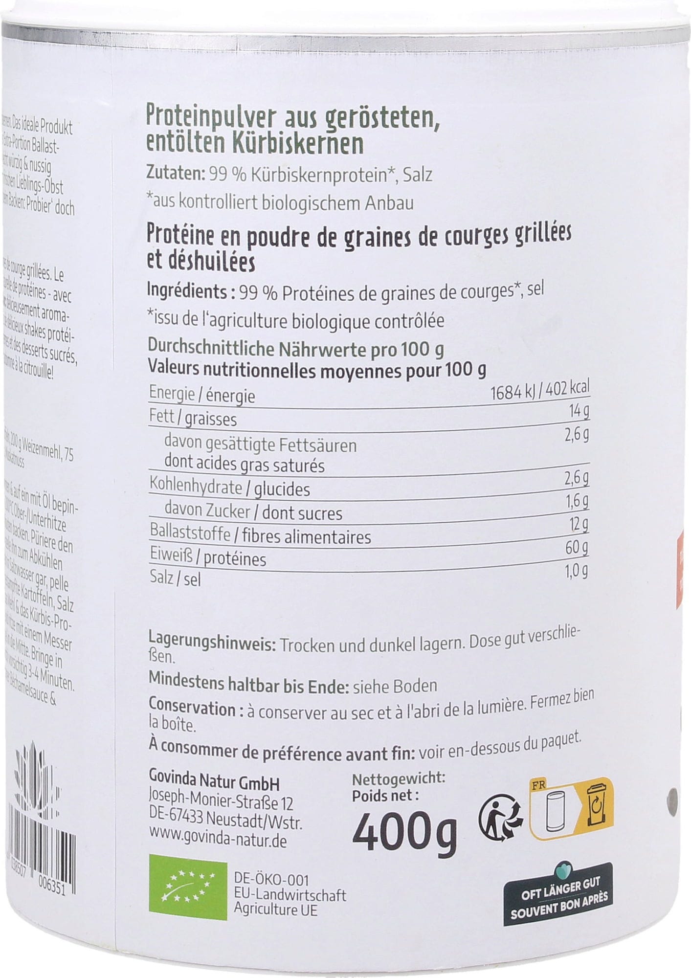 Govinda Proteinpulver Pumpa Ekologisk, 400 g 143 kr (358 kr / kg)