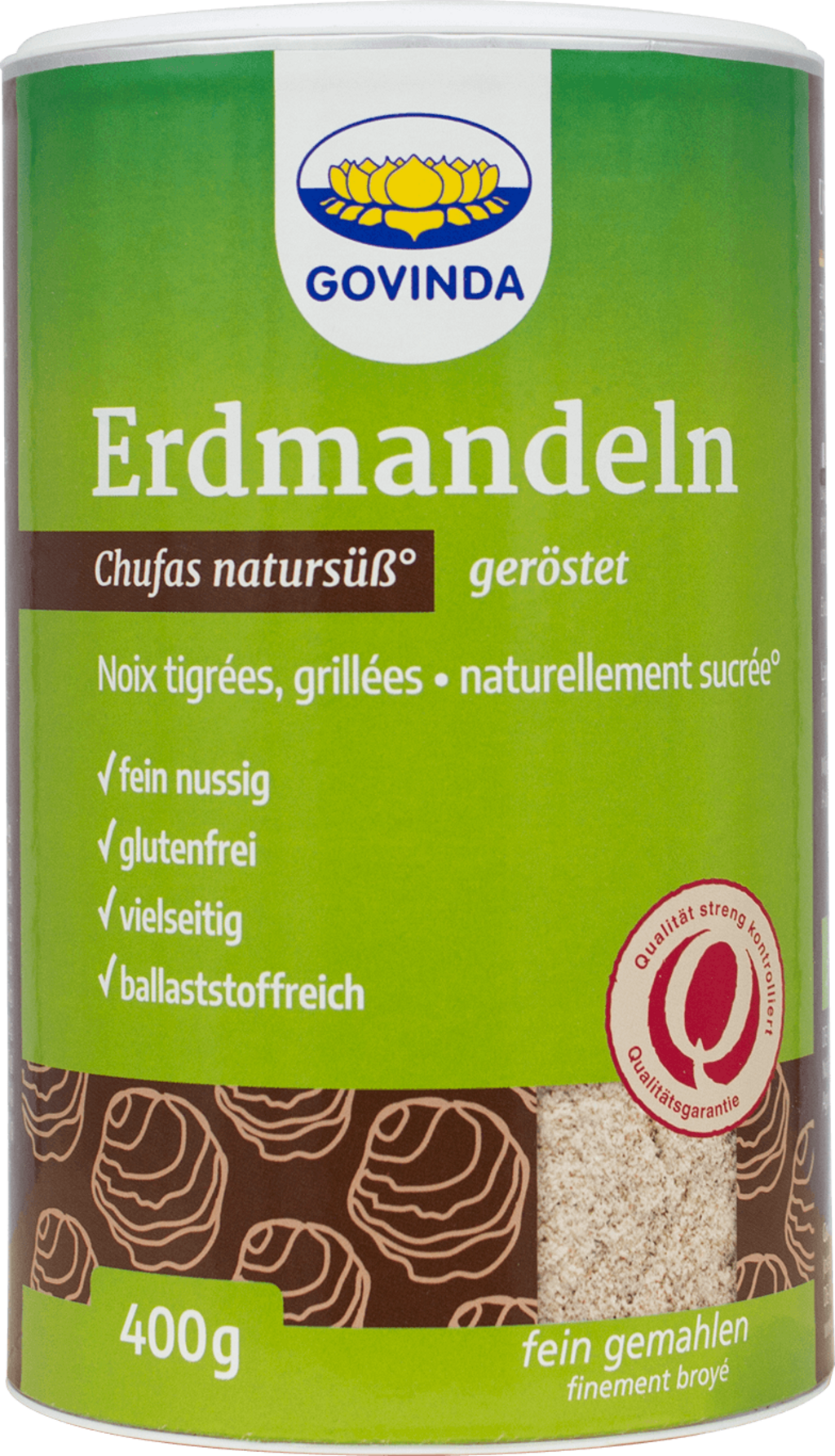 Tigernötter har en utmärkt smak som liknar en blandning av hasselnötter och mandel. Du kan ersätta alla bak- eller matlagningsrecept som innehåller mandel eller hasselnötter med tigernötter. Govindas malda tigernötter är särskilt rika på fibrer och är gluten- och laktosfria.