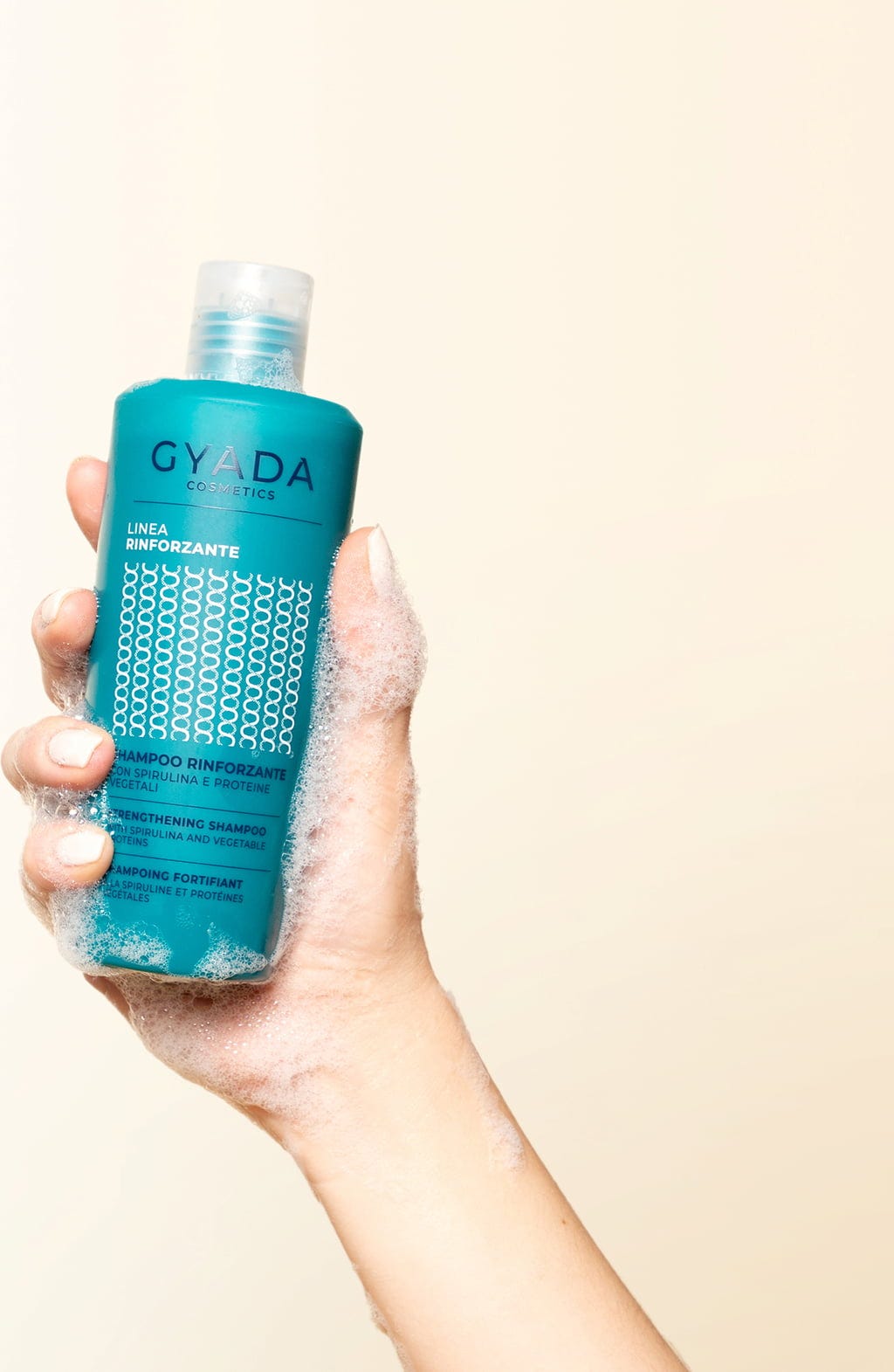 Gyadas förstärkande schampo ger stressat och tunt hår ny livskraft. Det är en koncentrerad produkt som återställer hår- och hårbotten och är lika lämplig för rengöring av torr och fet hårbotten. Den innehåller spirulina (marina alger rik på vitaminer, aminosyror och mineraler), fräkenväxt, ginseng och havre.