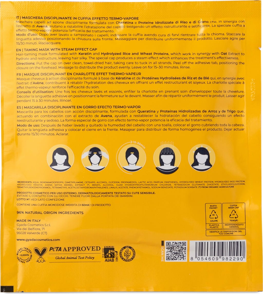 Denna mask med vete- och risproteiner, havrextrakt, keratin och panthenol ger krusigt hår optimal återfuktning och har en tämjande effekt. Detta gör det lättare att kamma utan att tynga ner håret. Dessutom erbjuder masken förbättrad absorption av de aktiva ingredienserna tack vare dess uppvärmningseffekt och därmed intensivvård.