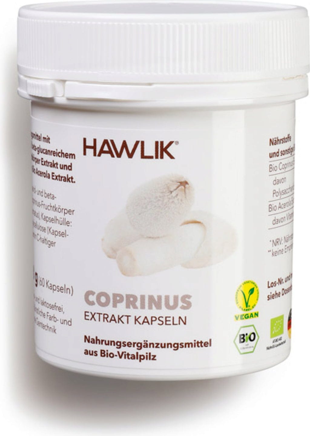 Den vitala svampen Coprinus, även känd som Coprinus comatus, utgör grunden för dessa naturliga kapslar för kosttillskott. Det fina fruktpulvret bearbetas med hjälp av en traditionell varmvattenmetod. Den innehåller polysackarider och betaglukaner. Kapslarna är också förädlade med C-vitamin från ekologiskt acerola-extrakt.