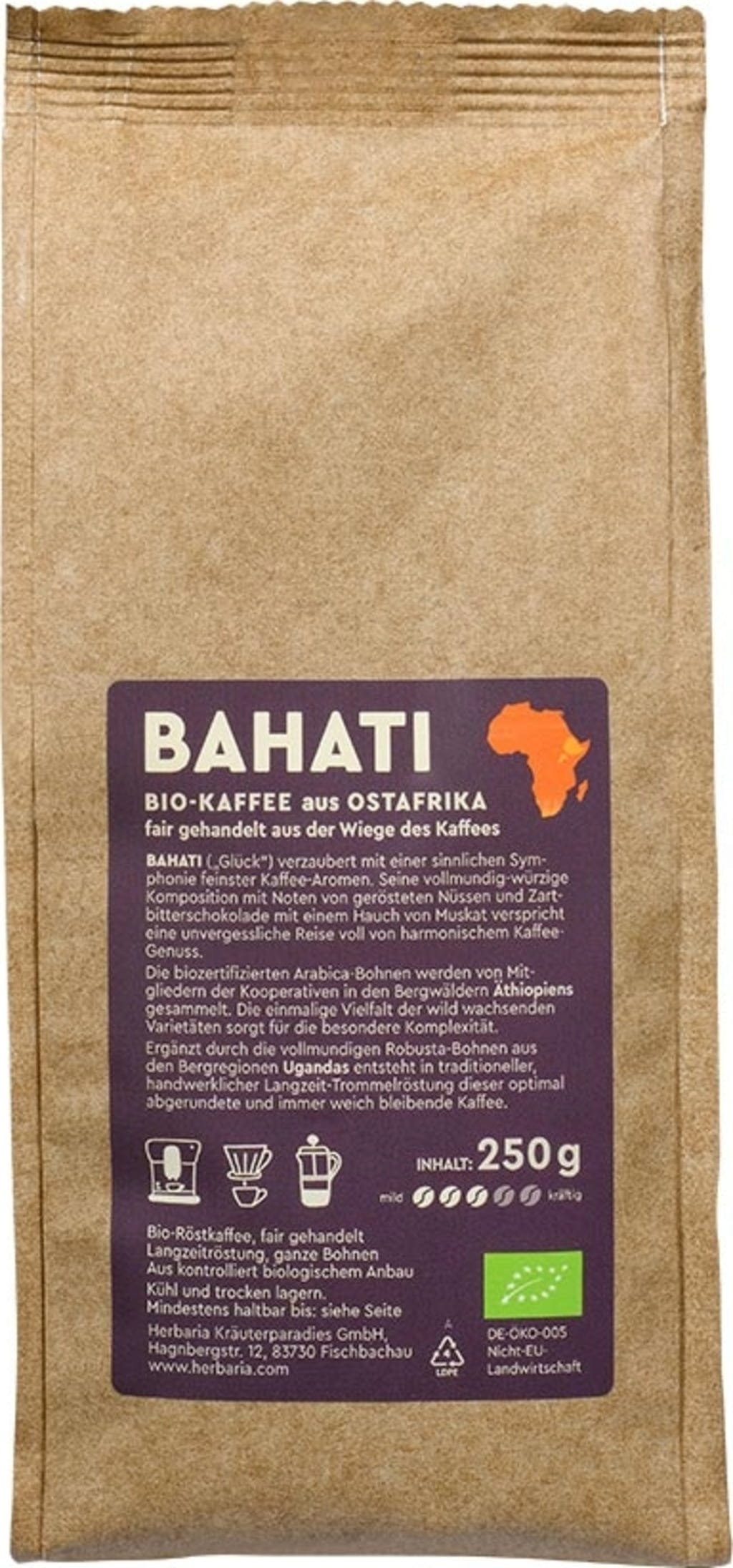 BAHATI betyder ungefär lycka - bara det beskriver de fina kaffesmakerna från Östafrika på ett mycket träffande sätt. Detta ekologiska kaffe kommer att föra dig bort med sin fylliga, kryddiga sammansättning som kombinerar toner av rostade nötter, mörk choklad och en antydan till muskotnöt.