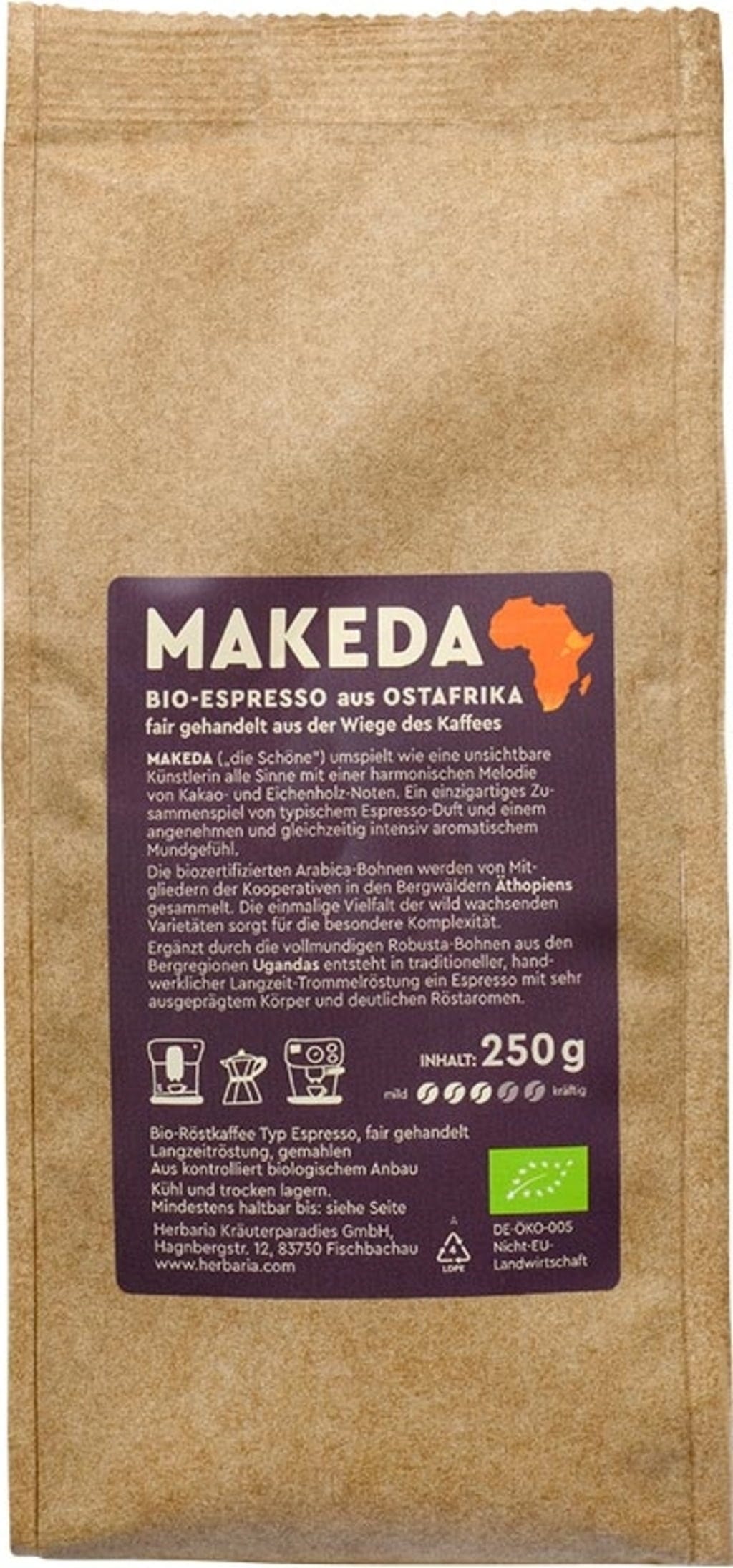 Dyk in i världen av MAKEDA (den vackra), en ekologisk espresso från Östafrika som lockar dina sinnen med harmoniska toner av kakao och ek. Denna unika smakupplevelse kombinerar den typiska espressodoften med en intensiv men ändå behaglig munkänsla.