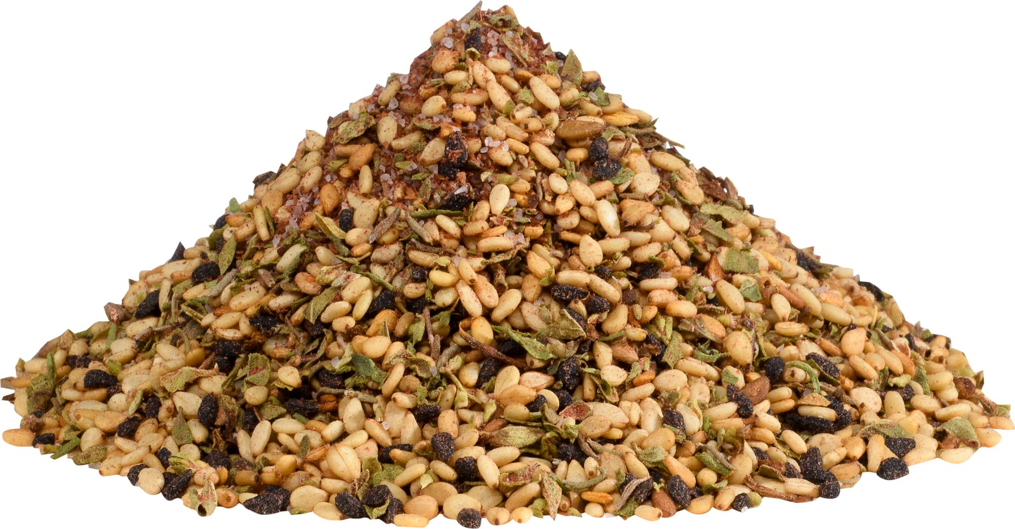 rostad Vit sesam[1], Bär av sumak[1], Svart kummin[1], Bergsalt, Oregano[1], Thymian[1], Isop[1]