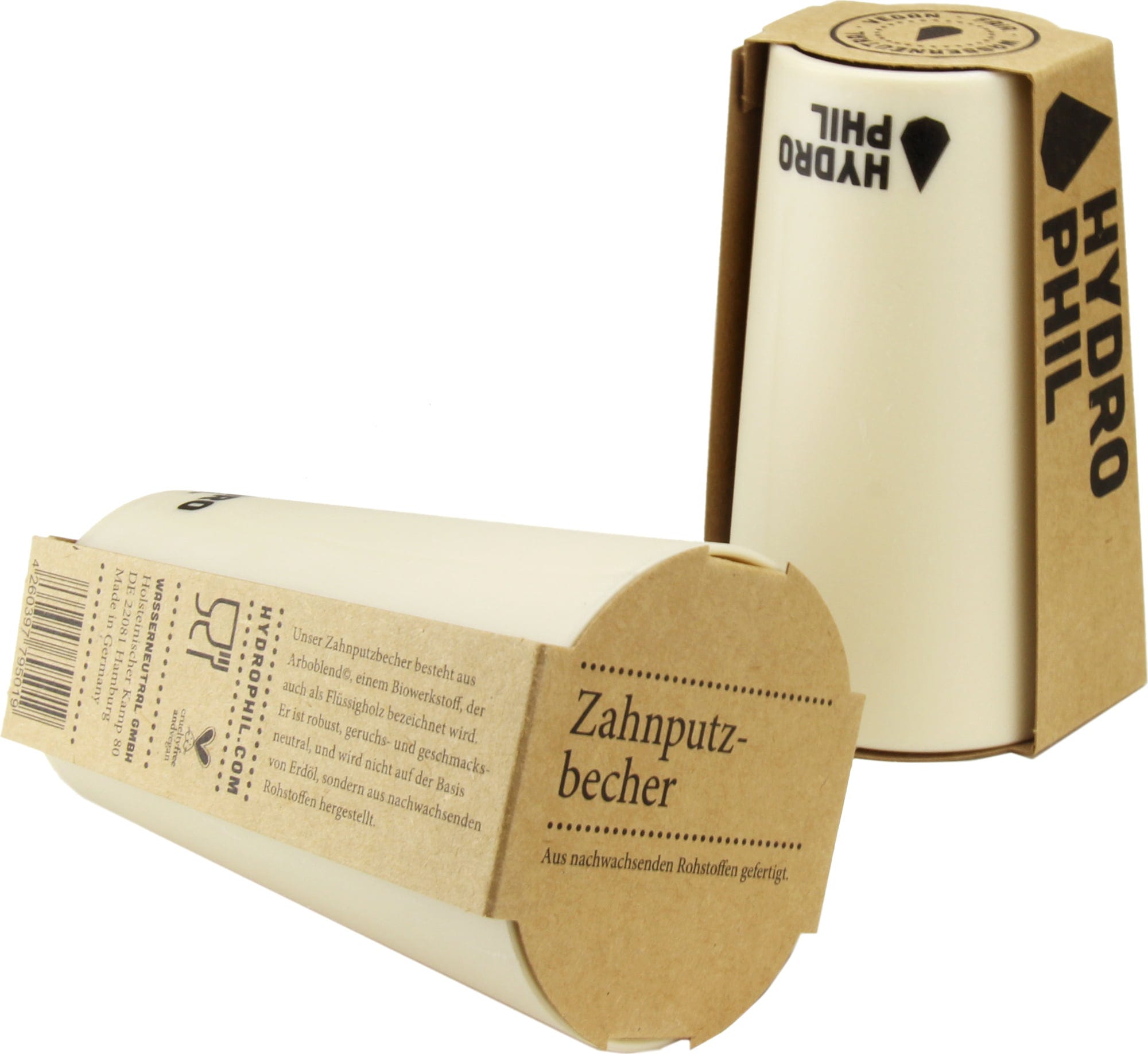 Ser ut som plast, men det är det inte! Den innovativa tandborstkoppen från Hydrophil övertygar med stabilitet, hållbarhet och funktionalitet och är tillverkad av helt naturliga material. Den är tillverkad i Tyskland av arboblend, ett exceptionellt material som består av träavfall, sockerstärkelse och andra naturliga råvaror och kallas även "flytande trä". Dessutom är muggen livsmedelssäker och därför perfekt att blanda i örtvatten.