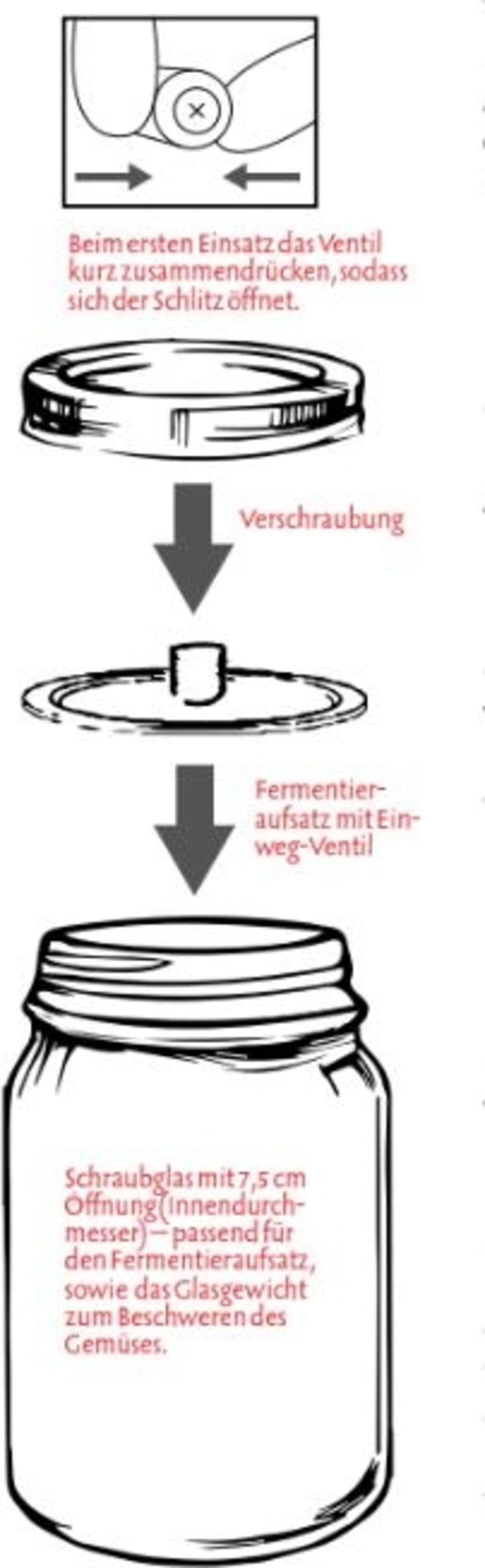 Skåran i envägsventilen släpper ut övertrycket och skyddar innehållet mot yttre påverkan. (Vid första användning: kläm ihop ventilen lätt för att öppna skåran.) Fyll glaset tätt med grönsaker – utan luftfickor. Vid finhackade grönsaker är en grönsakstamper >>här tillgänglig till god hjälp. Avsluta med att placera glasvikten ovanpå.