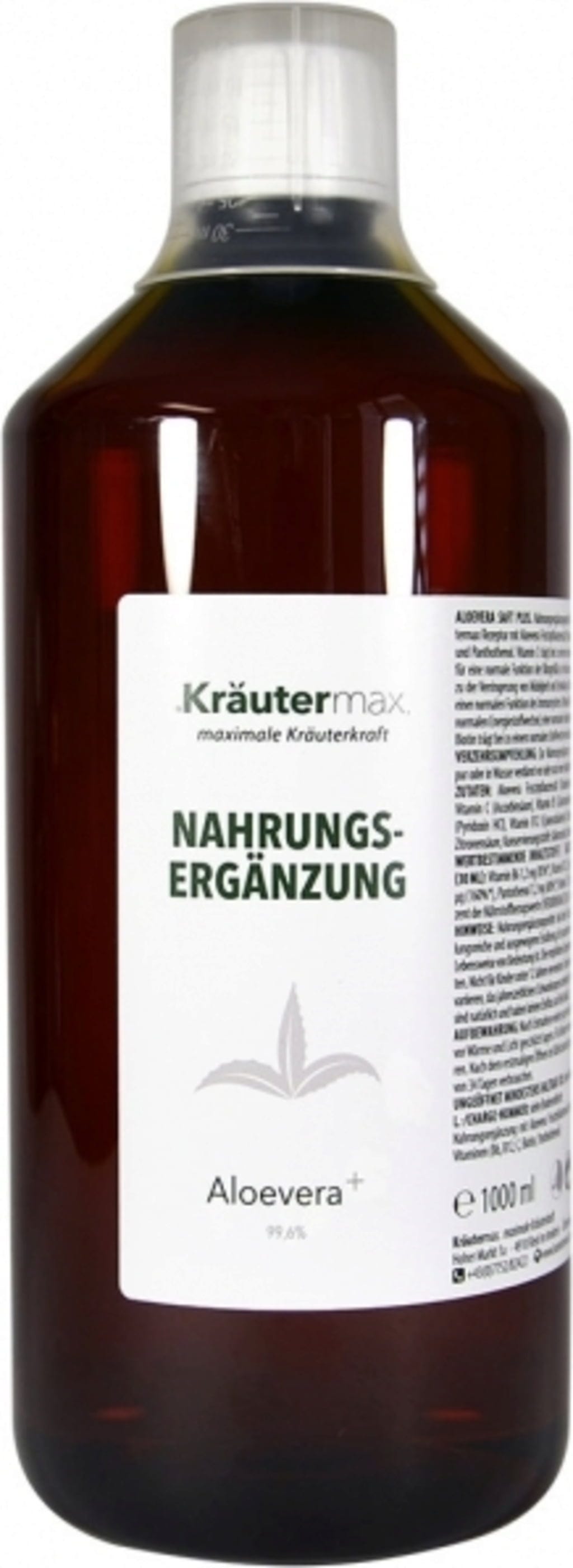 Aloe vera plus-juice från Kräutermax är 99,6% aloevera-juice från färska växter med vitamin B6, B12, C, biotin och pantothenol.