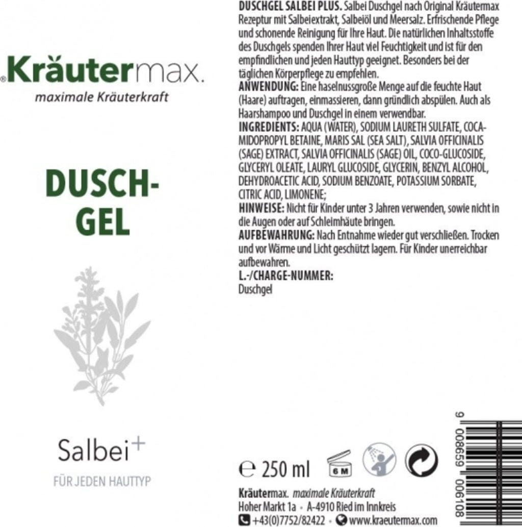 Kräutermax Shower Gel Sage plus innehåller en original Kräutermax-formula med salviaextrakt, salviaolja och havssalt.