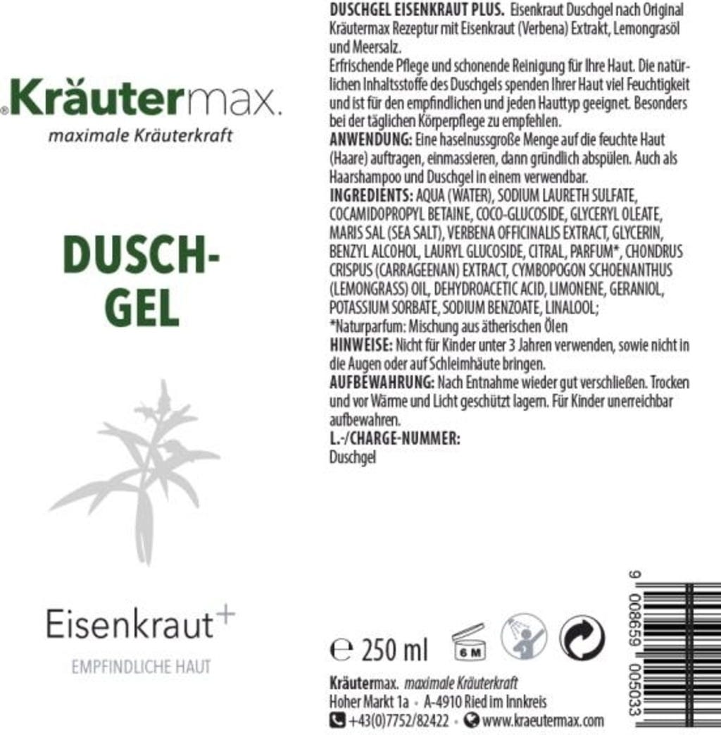 Duschgelen Verbena plus från Kräutermax innehåller en original Kräutermax-formel med verbena (verbena)-extrakt, citrongräsolja och havssalt.