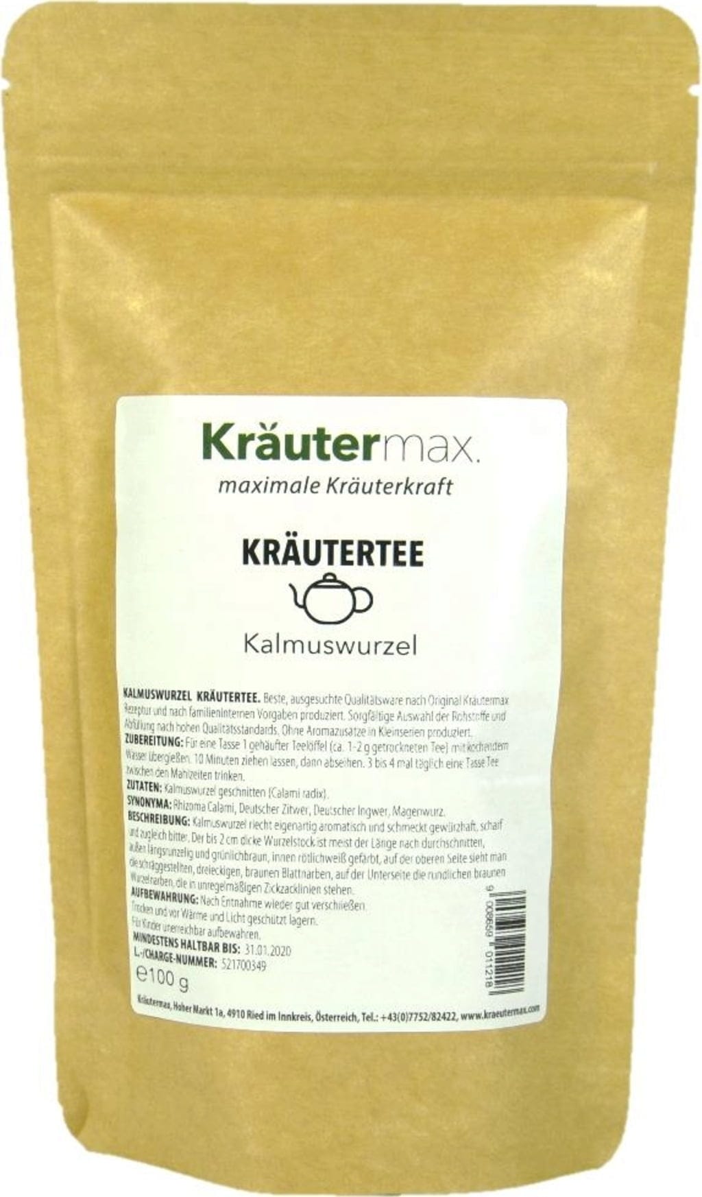 Den skurna calamusroten har en märklig doft och smakar starkt kryddigt, stickande och samtidigt något bittert. Örtteet av kalamusrot tillverkas enligt det ursprungliga Kräutermax-receptet med hög kvalitet.