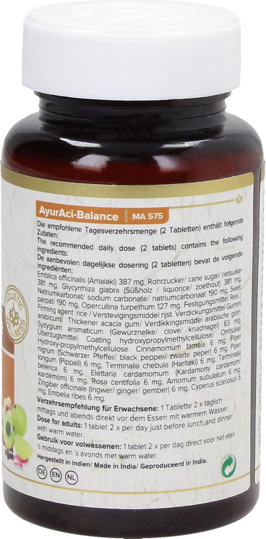 52 % Örter (Amla (Amalaki, Emblica officinalis) Frucht, Süßholz (Glycorrhiza glabra), Turpethwurzel, Gewürznelken, Ingefära, Schwarzer Pfeffer (Piper nigrum), langer Pfeffer (Pippali, Piper longum), Myrobalanen-Fruchtpulver, Bibhitaki (Terminalia bellerica) Extrakt, Musta (Knolliges Zypergras, Cyperus rotundus), Embelia Ribes, Kardamom (Elettaria cardamomum), Indisches Lorbeerblatt (Cinnamomum tamala), schwarzer Kardamom), rohrzucker, Swet parpati, Natriumcarbonat[1], Gummi Arabicum[2], Talk[3], Hydroxypropylmethylcellulose[4]