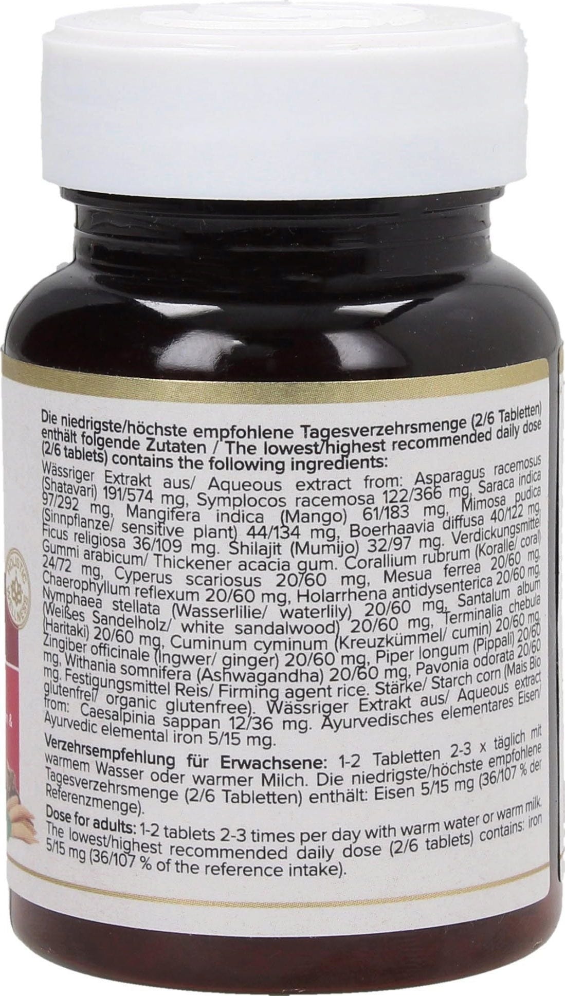 60 % Kräuter Extrakte (Indischer Spargel (Shatavari, Asparagus racemosus), Symplocos racemosa, Ashoka (Saraca indica), Mango, Sinnpflanze, Boerhaavia diffusa, Feigenwürfel, Caesalpinia sappan), 24 % Örter (Nagasbaum, Pavonia odorata, Aconitum heterophyllum, Cyperus scariosus, Kutaja (Kutaj, Holarrhena antidysenterica), Wasserlilie, Weißes Sandelholz, Myrobalanen-Fruchtpulver, kummin, Ingefära, langer Pfeffer (Pippali, Piper longum), Schlafbeere (Ashwagandha, Withania Somnifera)), Bergbalsam, Gummi Arabicum[1], Korallen Pulver, Eisenpyrit, Mais[4], Calciumcarbonat[2], Talk[3]