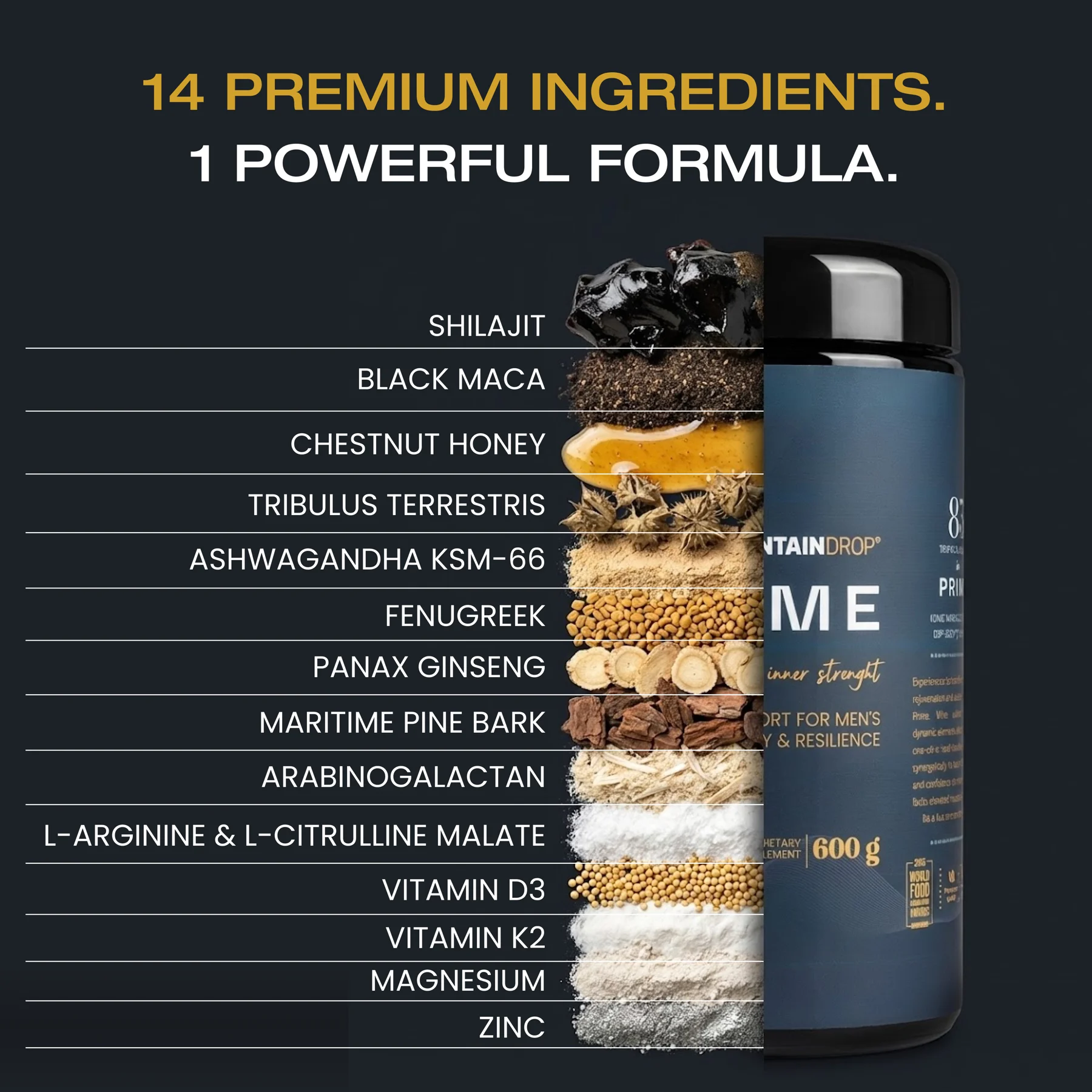Kastanj honung, Shilajit-Harz, Magnesiumbisglycinat (11 % Magnesium), L-Arginin, Maca Extrakt, Arabinogalaktan, Tribulus Terrestris extrakt (90 % Saponiner, KSM-66® Ashwagandha-Wurzelextrakt (5 % Withanolides)), bockhornsklöverfröextrakt (50 % Saponiner), L-citrullinmalat, Panax ginseng extrakt (6 % Ginsenosider), Extrakt av havtorn, Zink-L-Monomerhionin (18 % Zink), Vitamin D3 (Cholecalciferol), Vitamin K2 (menakinon-7) MK-7