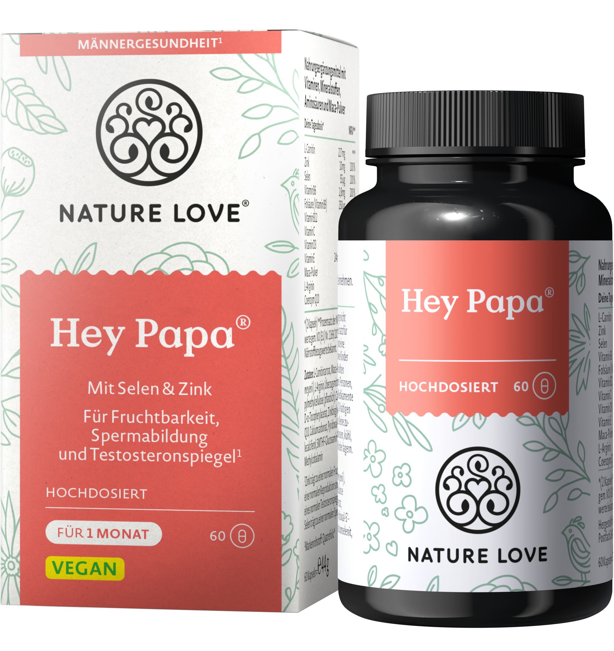 Hey Papa-kapslarna från Nature Love är utformade för att ge näringsmässigt stöd till män som önskar bli föräldrar. Kapslarna innehåller bland annat selen, zink, maca, Q10, folsyra och vitamin D3. Eftersom vitamin D3 kommer från lav är kapslarna även helt veganska.