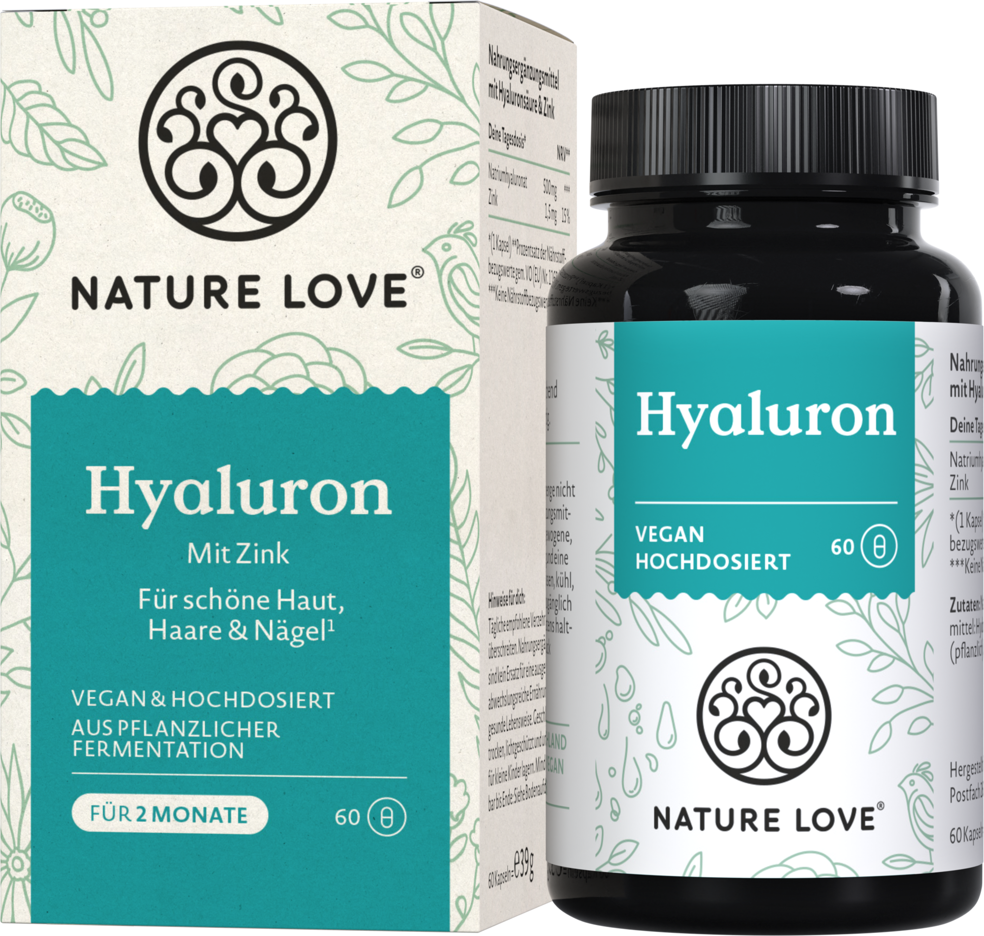 Hyaluronkapslarna från Nature Love ger 500 mg hyaluronat per kapsel , som erhålls från majs genom jäsning. Optimerad med mycket biotillgängligt zinkbisglycinat.