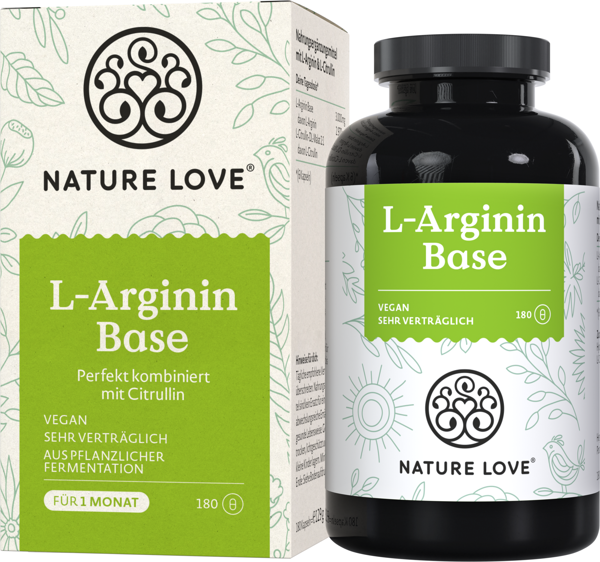 Med sin L-Arginine Base har Nature Love utvecklat ett preparat som gör det lättare för dig att tillföra L-Arginin. Kapslarna ger dig 3000 mg L-arginin från växtfermentering per daglig dos. Optimerad med L-Citrulline.