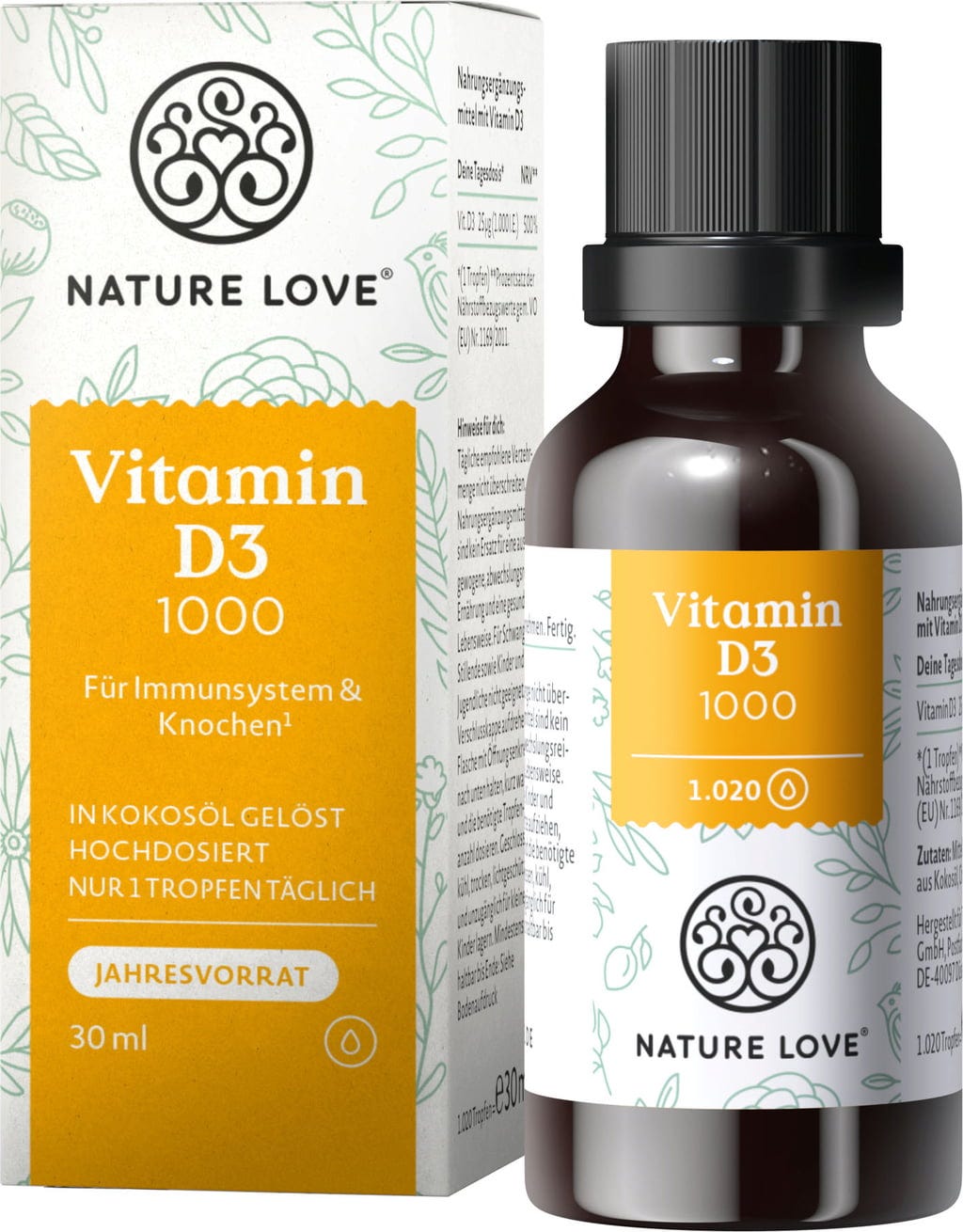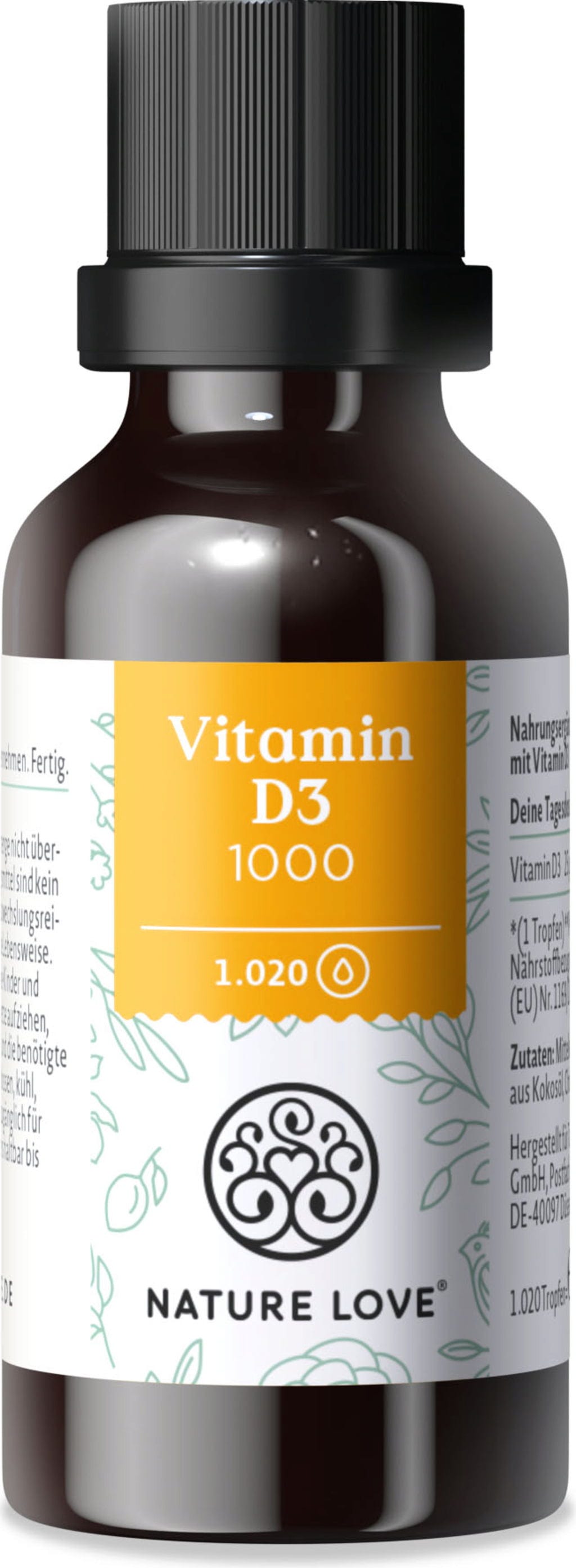 I bästa fall täcker vi vårt behov av vitamin D3 med solljus som träffar och värmer vår hud. Det finns dock inte alltid tillräckligt många soliga dagar för att tillgodose vårt behov av D3-vitamin. Nature Love tillhandahåller D3-vitamin upplöst i högkvalitativ kokosolja med sina högdoserade droppar. Lämplig för vegetarianer.